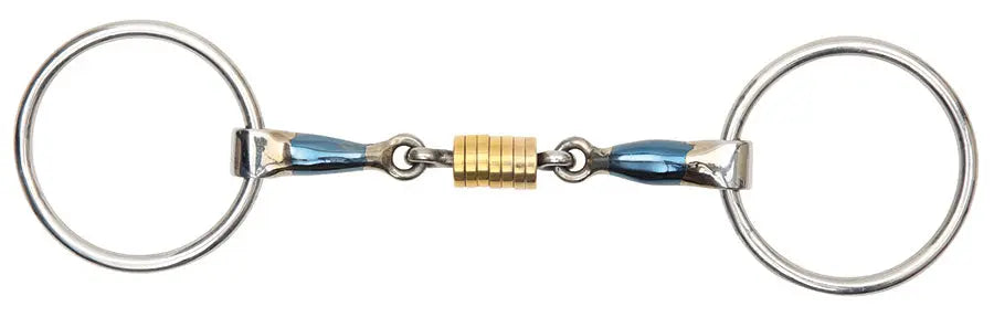- 15mm double jointed mouthpiece with roller link to discourage fixing or leaning- Blue sweet iron and brass alloy discs help to encourage mouthing and acceptance of the contact- Brass alloy discs help to soothe a fussy-tongued horse