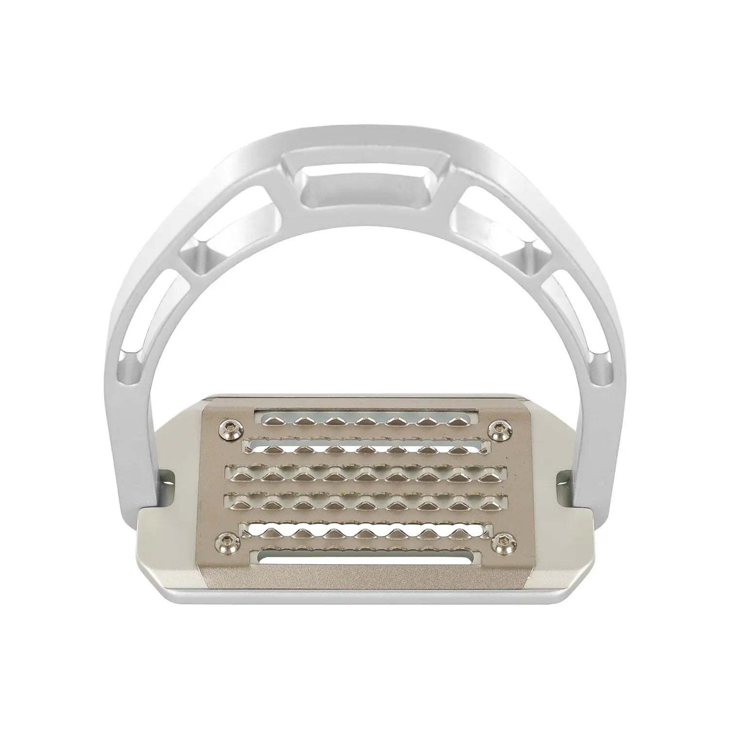 >The upper footbed is made of stainless steel, with long horizontal holes. The 5° inclined tread helps riders to assume the correct posture, relieving tension in the ankles, calves, knees and hips.