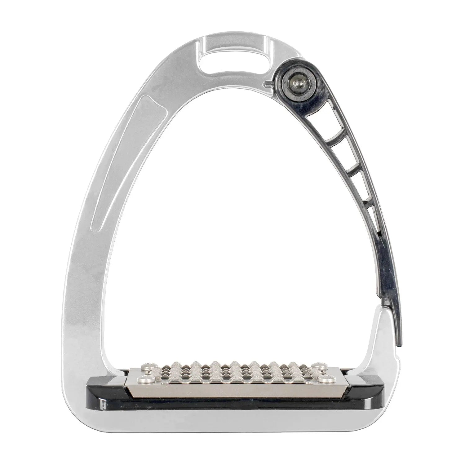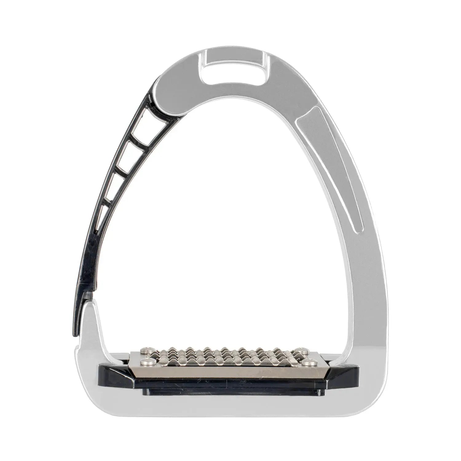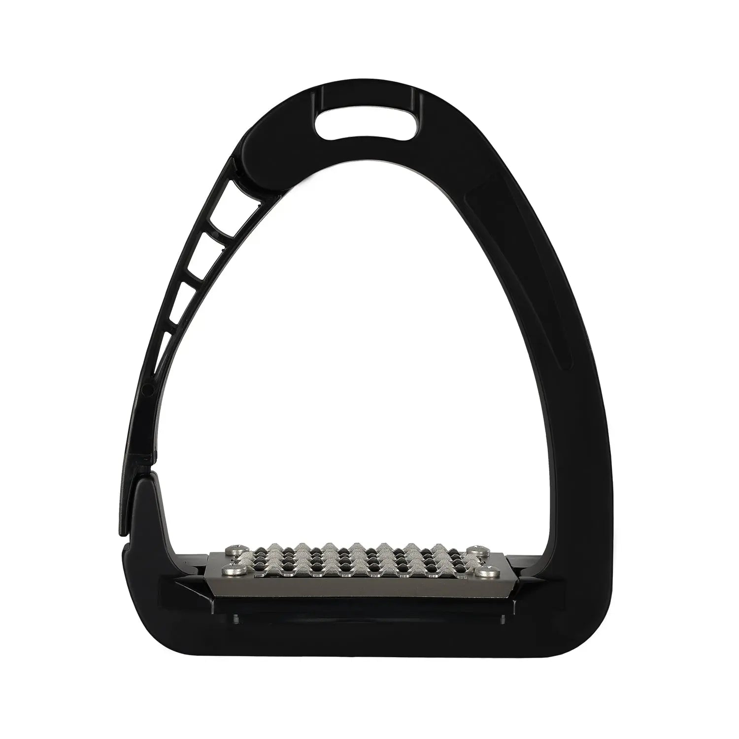 The inner arm and footplate are made from a continuous integrated metal for strength, while the opening arm uses an advanced polyamide material for improved flexibility and comfort. This blend of metal and flexible polymers reduces stiffness compared to traditional stirrups, offering a smoother riding experience. The cushioned spring effect helps absorb impact, which is ideal for riders with hip, knee or ankle discomfort and beneficial for all riders seeking improved comfort. The metal tread features triangular teeth that increase foot stability in all weather conditions.