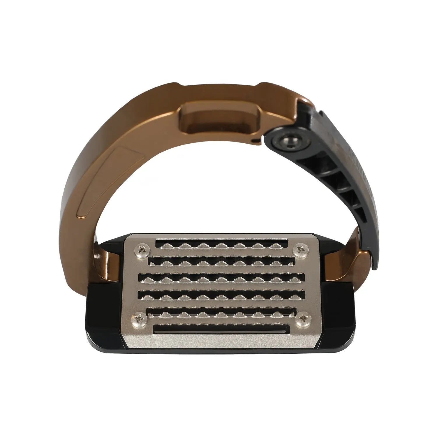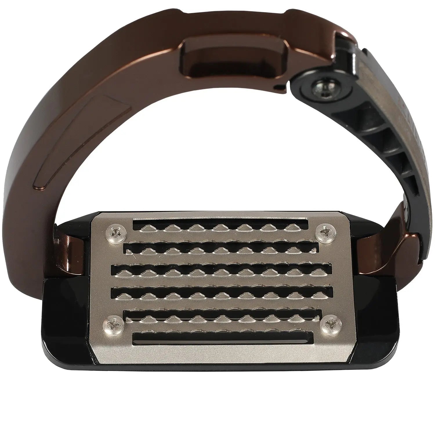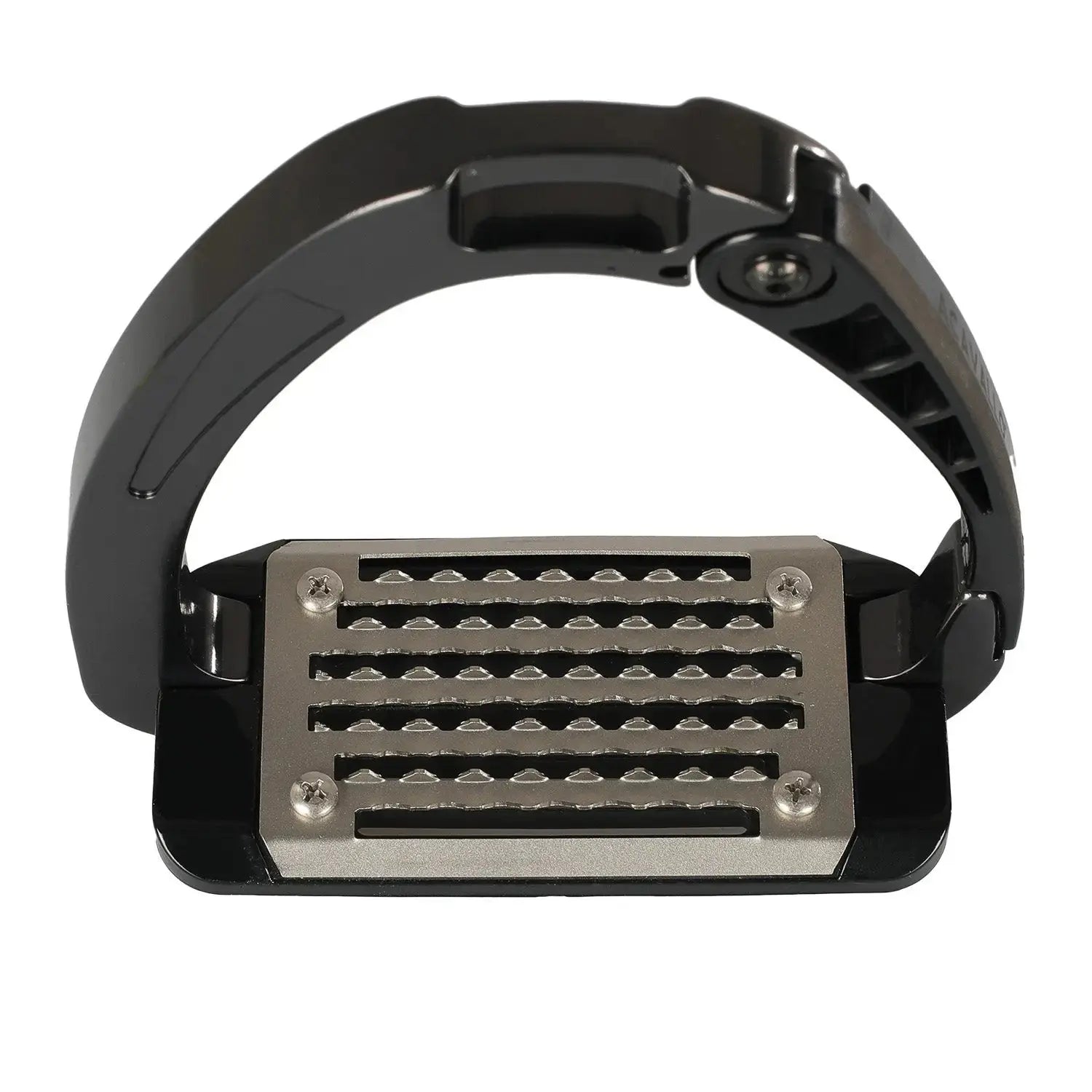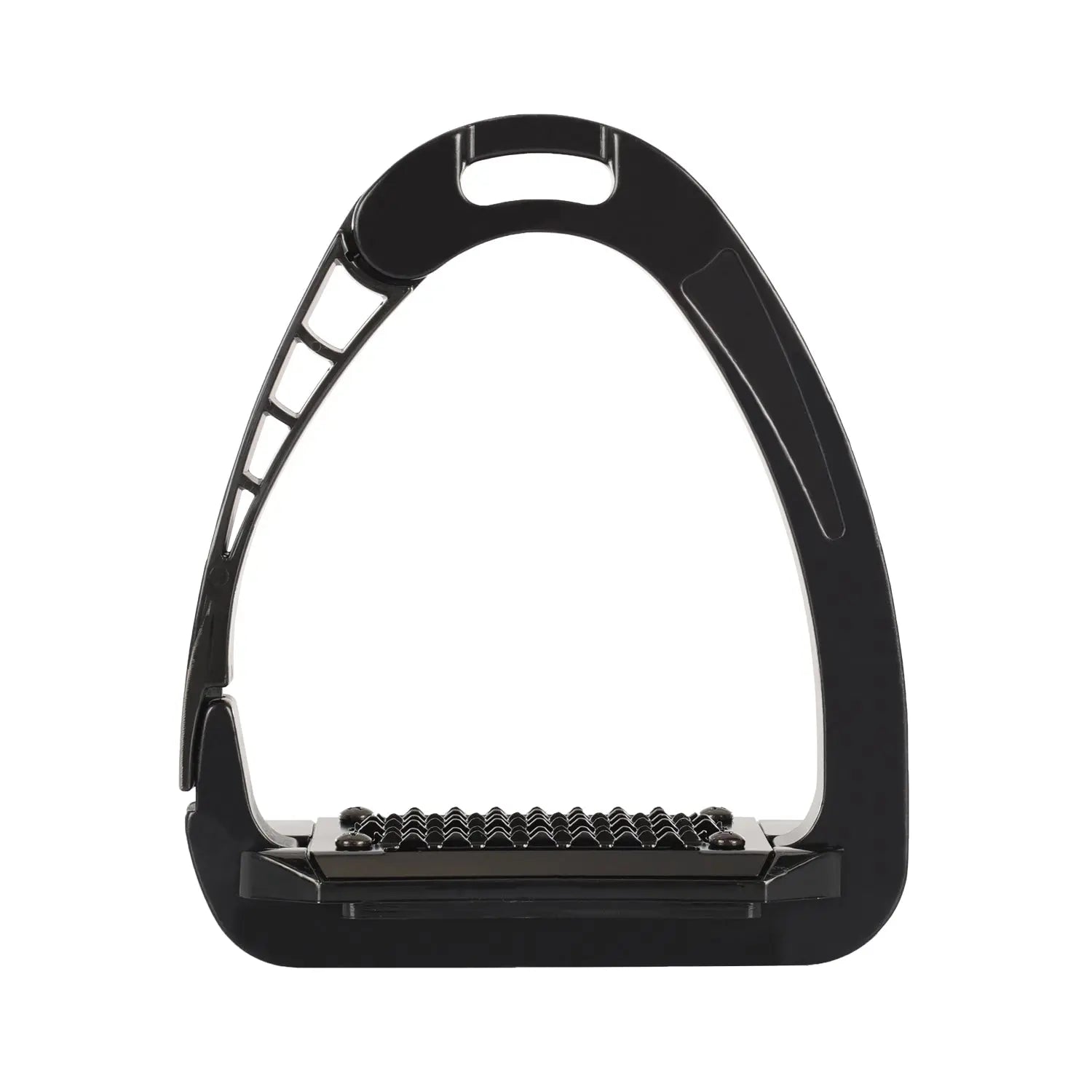 The inner arm and footplate are made from a continuous integrated metal for strength, while the opening arm uses an advanced polyamide material for improved flexibility and comfort. This blend of metal and flexible polymers reduces stiffness compared to traditional stirrups, offering a smoother riding experience. The cushioned spring effect helps absorb impact, which is ideal for riders with hip, knee or ankle discomfort and beneficial for all riders seeking improved comfort. The metal tread features triangular teeth that increase foot stability in all weather conditions.