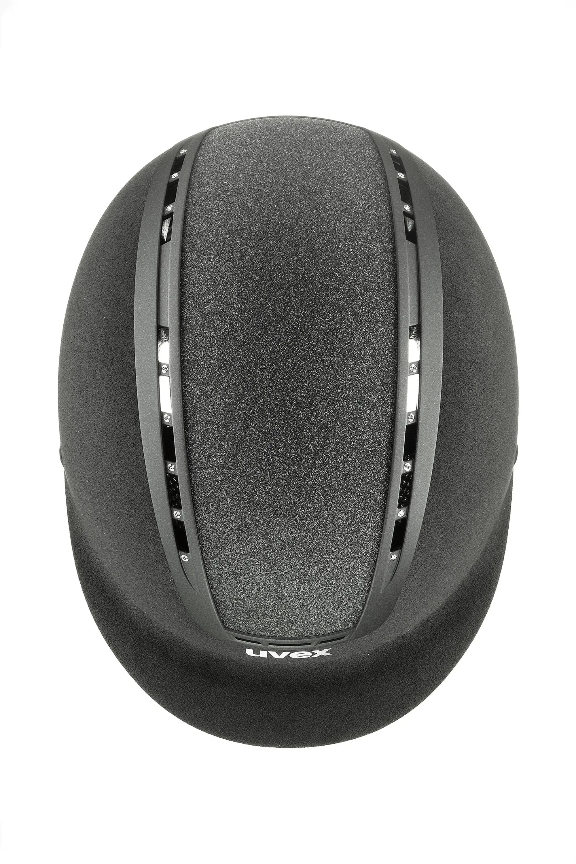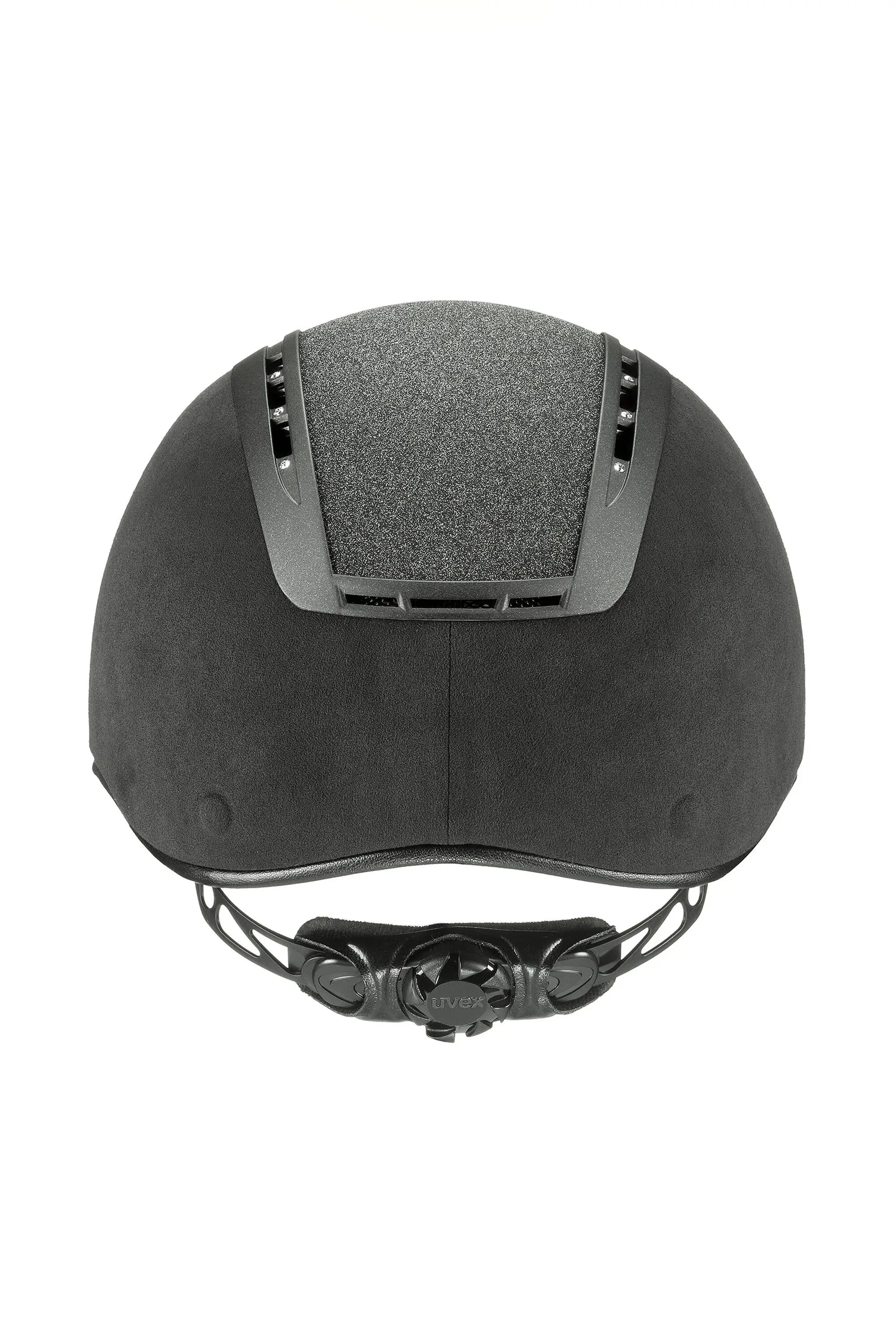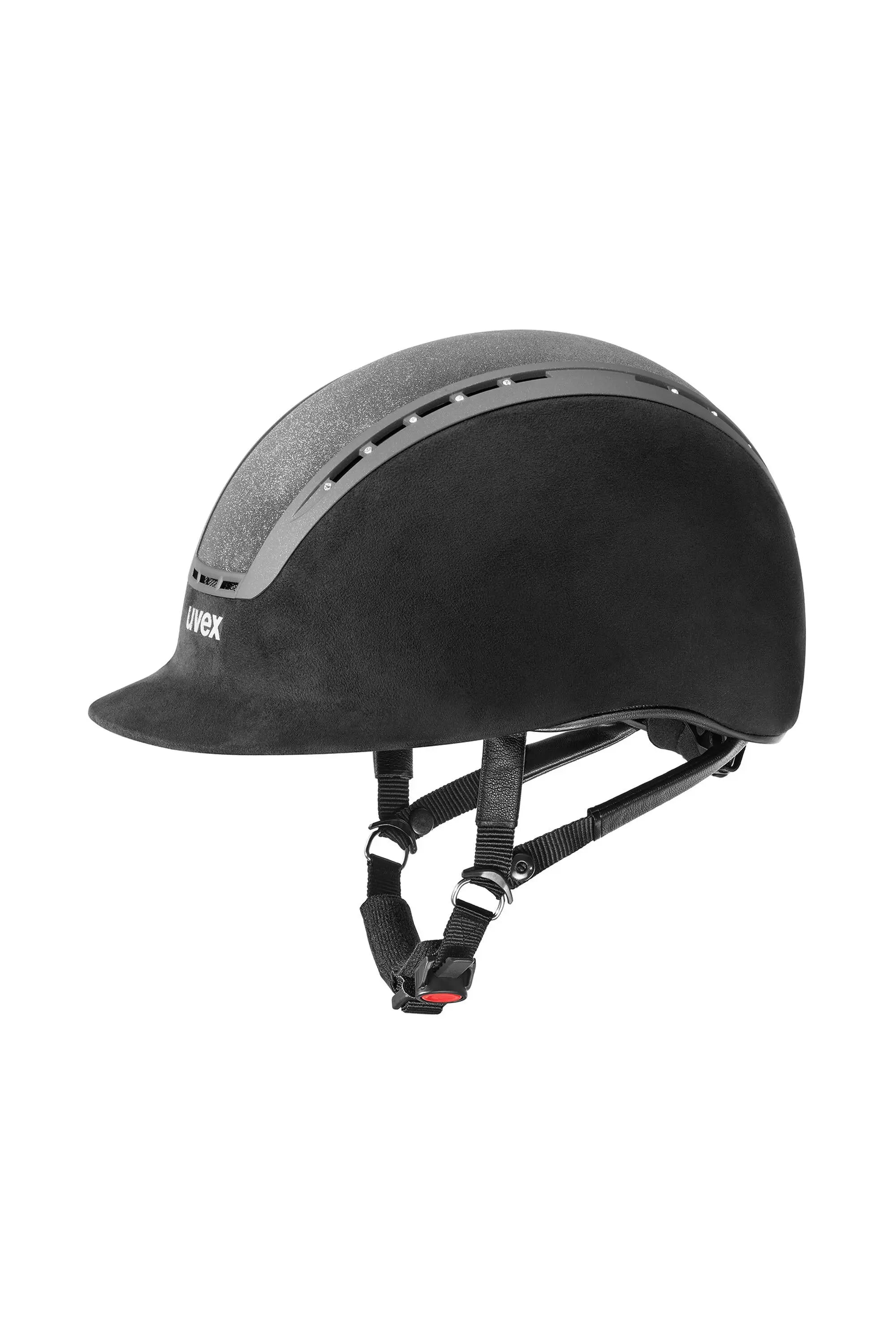 The Uvex Suxxeed Glamour Riding Helmet is a sophisticated, statement peaked riding helmet pairing a glamourous sparkling glitter finish and beautiful Swarovski® crystals with the finest velour effect Alcantara material outer. Ventilation channels along the top, front and back of the hat ensure breathability to keep you comfortable and cool during every wear. This bestselling helmet is an ideal choice for dressage and show jumping, making a stylish and eye-catching addition to your competition outfit while ultimately ensuring your safety.