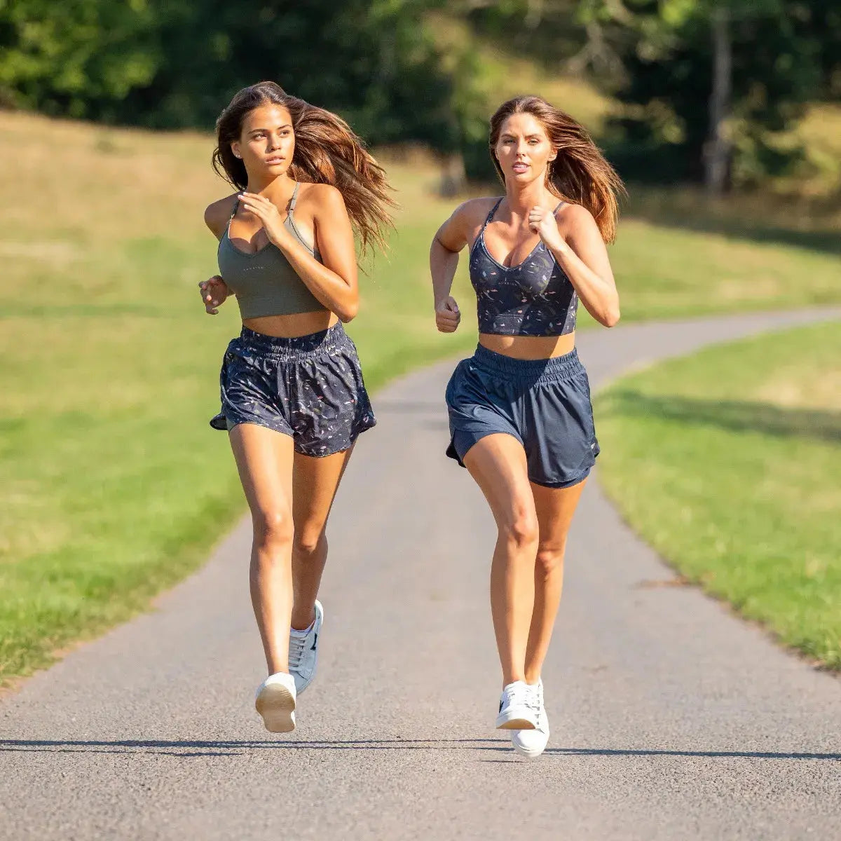 Style detail: loose fit over-shorts with built-in liner shorts, deep supportive waistband, inner stretch drawstring, thigh phone pocket, comfort fabrics, Aubrion prints.