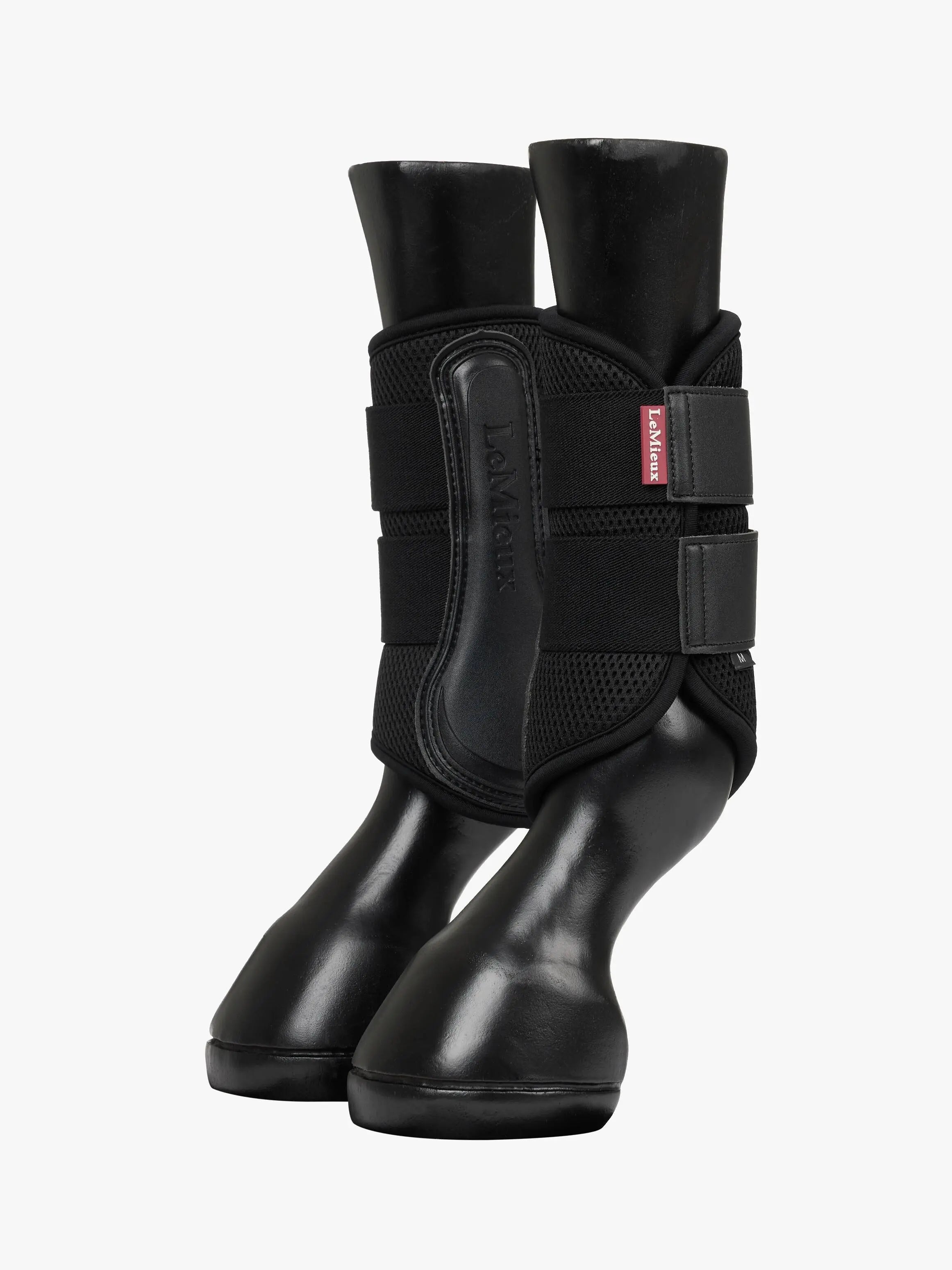 The LeMieux ProSport Black Mesh Brushing Boots are superb quality and smart brushing boots for schooling and competing. They are lightweight brushing boots with a perforated inner lining for breathability. The updated strike guard with debossed branding offers unbeatable defense against brushing knocks and scrapes, while the lightweight design and breathable mesh lining ensure maximum comfort. With reinforced panels and durable PU leather straps, these boots are perfect for schooling and competition. Suitable for both front and hind legs.