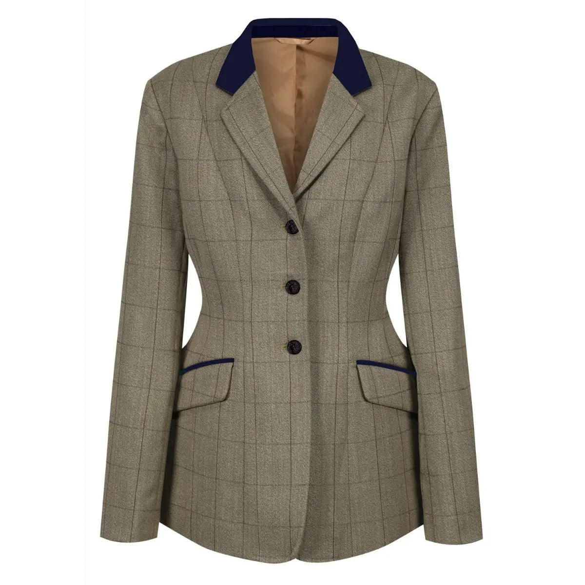 This traditional tweed competition jacket from Equetech is ideal for riders looking for a more subtle, stylish showing competition jacket for ladies; it features subtle brown and green overchecks for a traditional, stylish look in the show ring. With the added feature of navy velvet collar and pocket darts when compared to the standard Foxbury Ladies Jacket.
