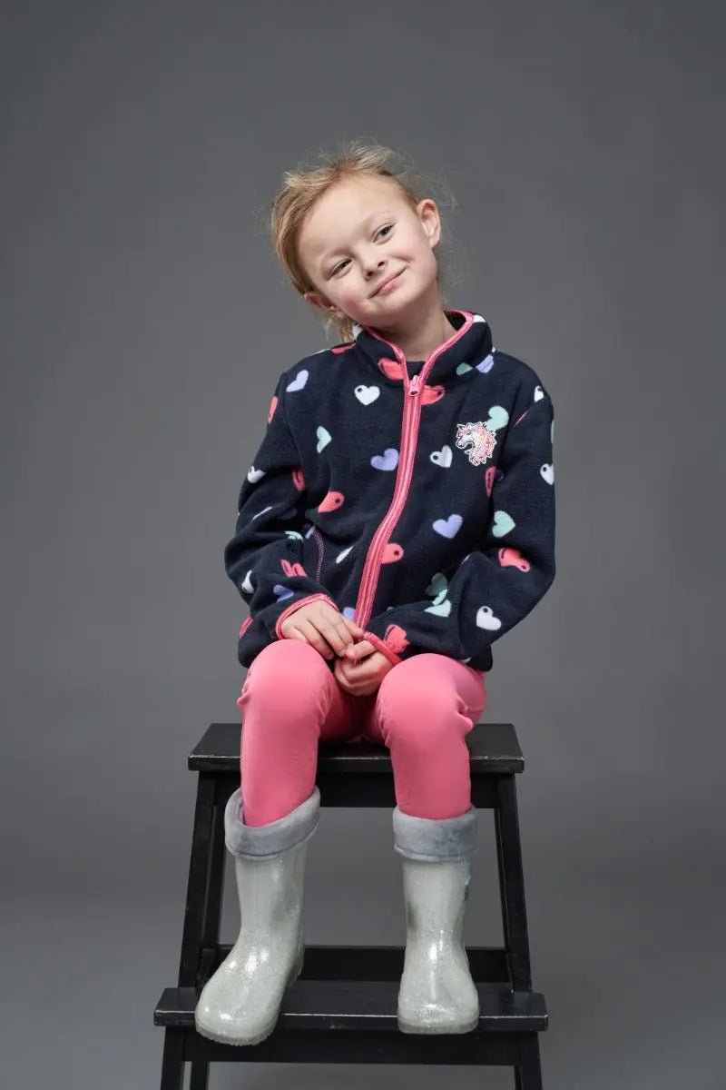This girls fleece is supplied in 92cm - 152cm in navy with heart pattern and unicorn overlay logo.