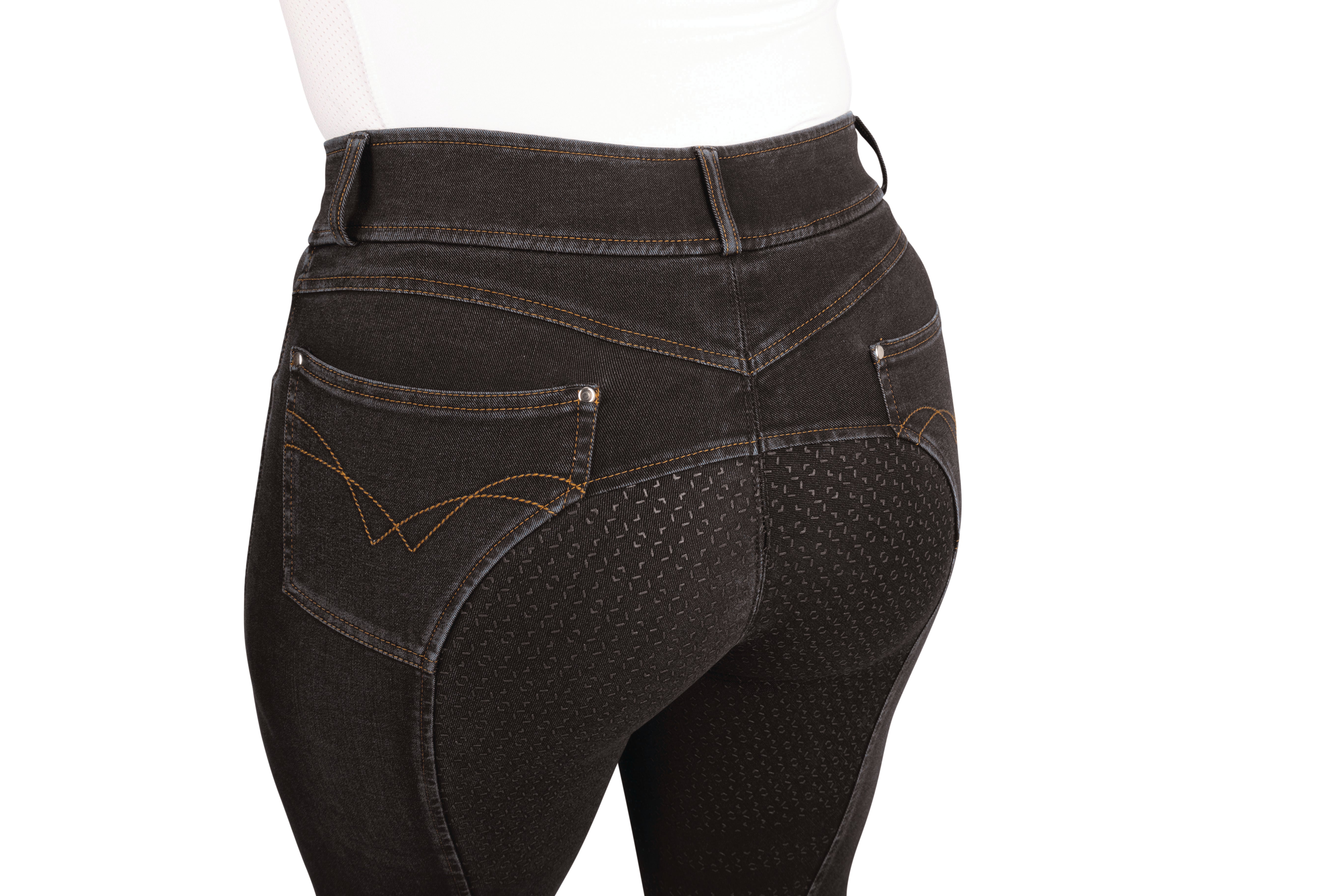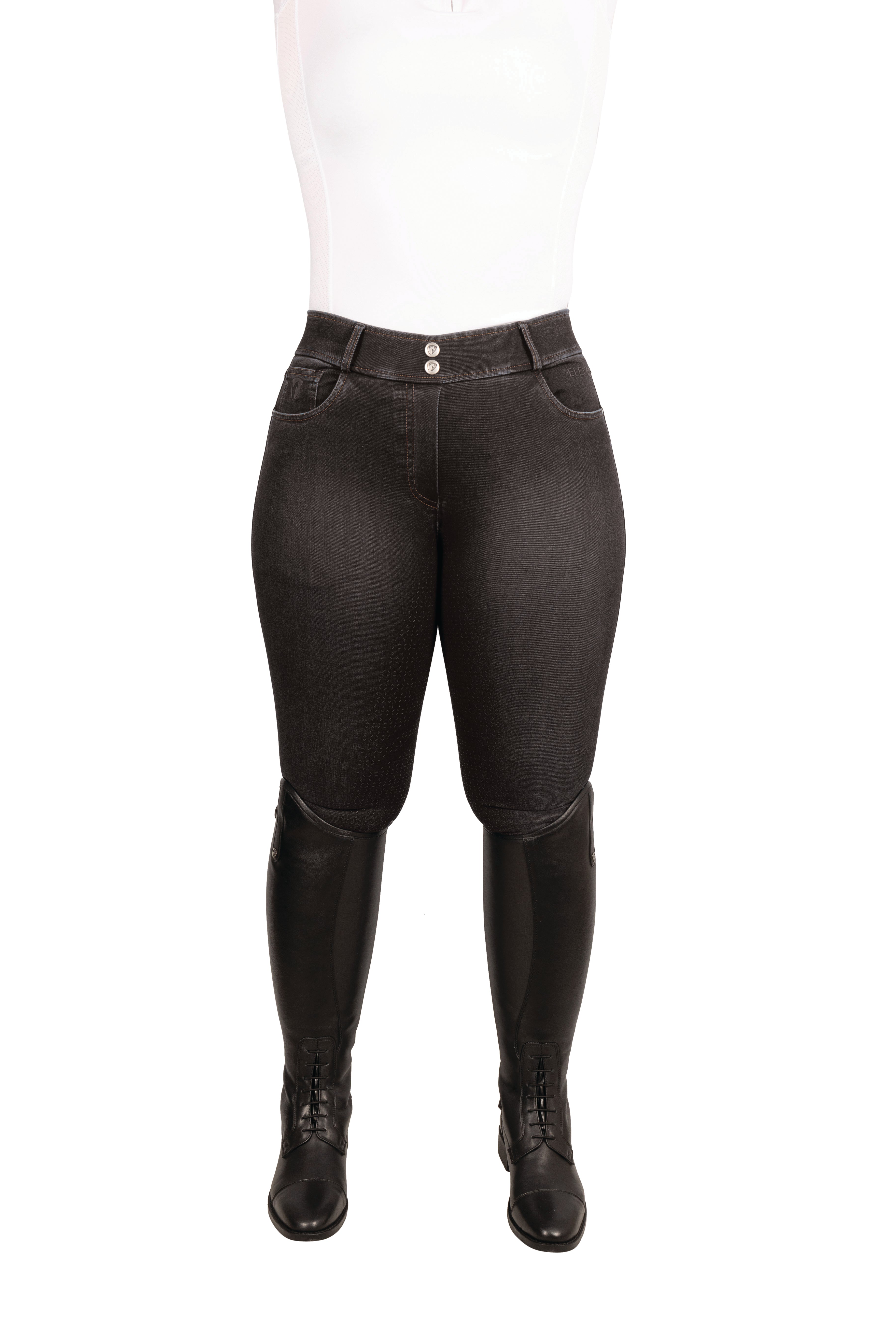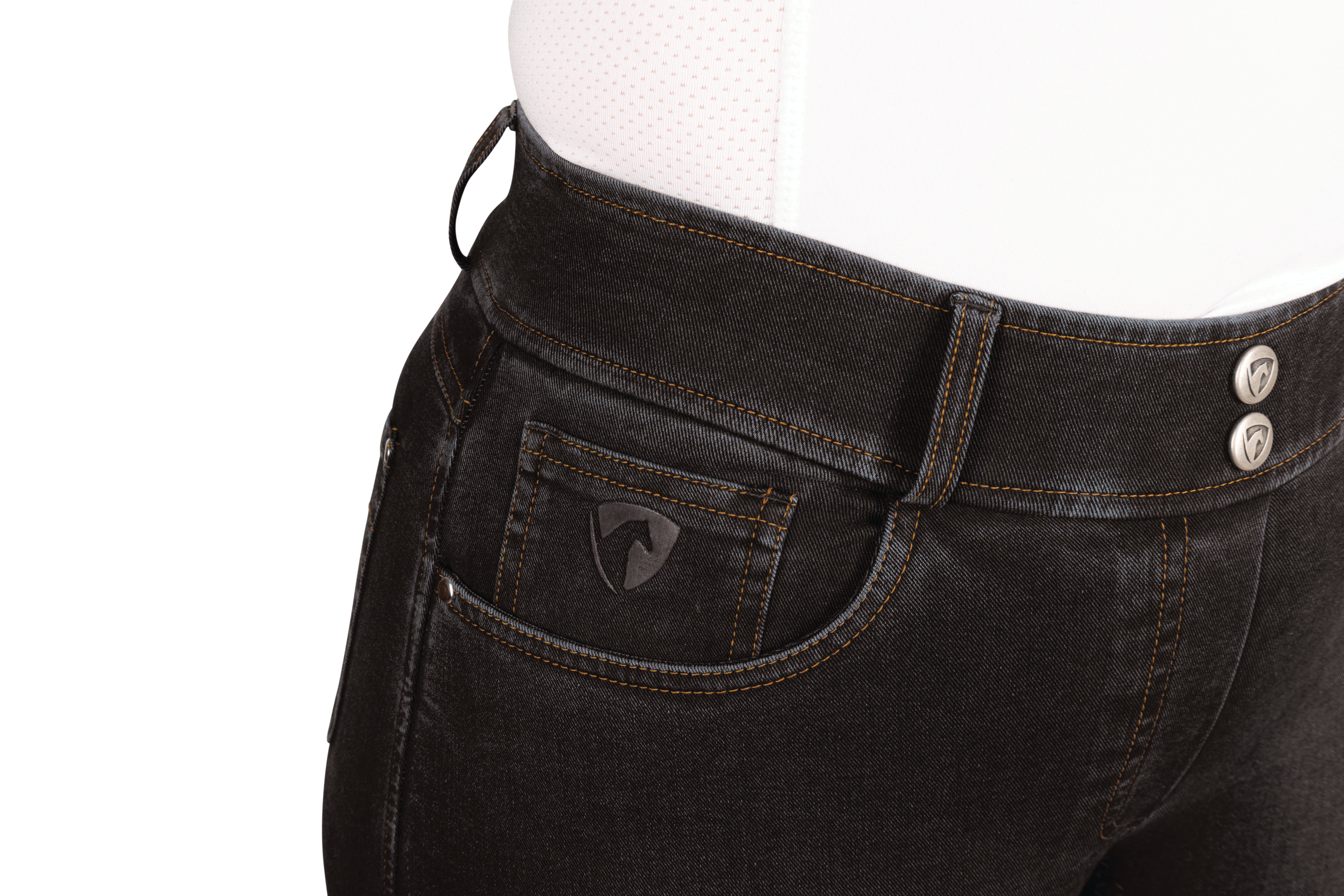 Create a relaxed and stylish look with the Elevate Style Denim Breeches. Made from a soft denim stretch fabric, these breeches move with every movement and will sit perfectly for a flattering shape. The practical rear pockets are detailed with intricate stitching and the tapered lower leg offers a contoured fit. The full silicone seat increases grip when in the saddle, whilst the tonal finish allows for these to be worn for more casual events. Fastened with durable Hy Equestrian gutos on a secure waistband with belt loops - accessorise your look with a belt to complete the look.