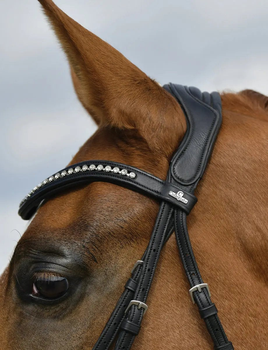 Featuring not one but two browband options, a plain curved leather browband perfect for everyday training and a stunning crystal detail curved browband to stand out in the show ring.