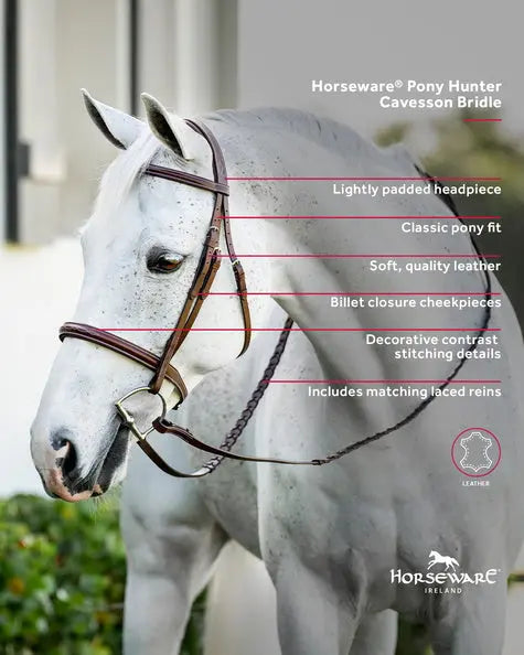The Horseware® Pony Hunter Cavesson Bridle with Reins brings distinctive style in a classic pony fit. Contrast fancy stitch detailing on the noseband, browband, and crown accents the soft, quality leather. A lightly padded headpiece ensures maximum comfort. Features billet style cheekpieces.