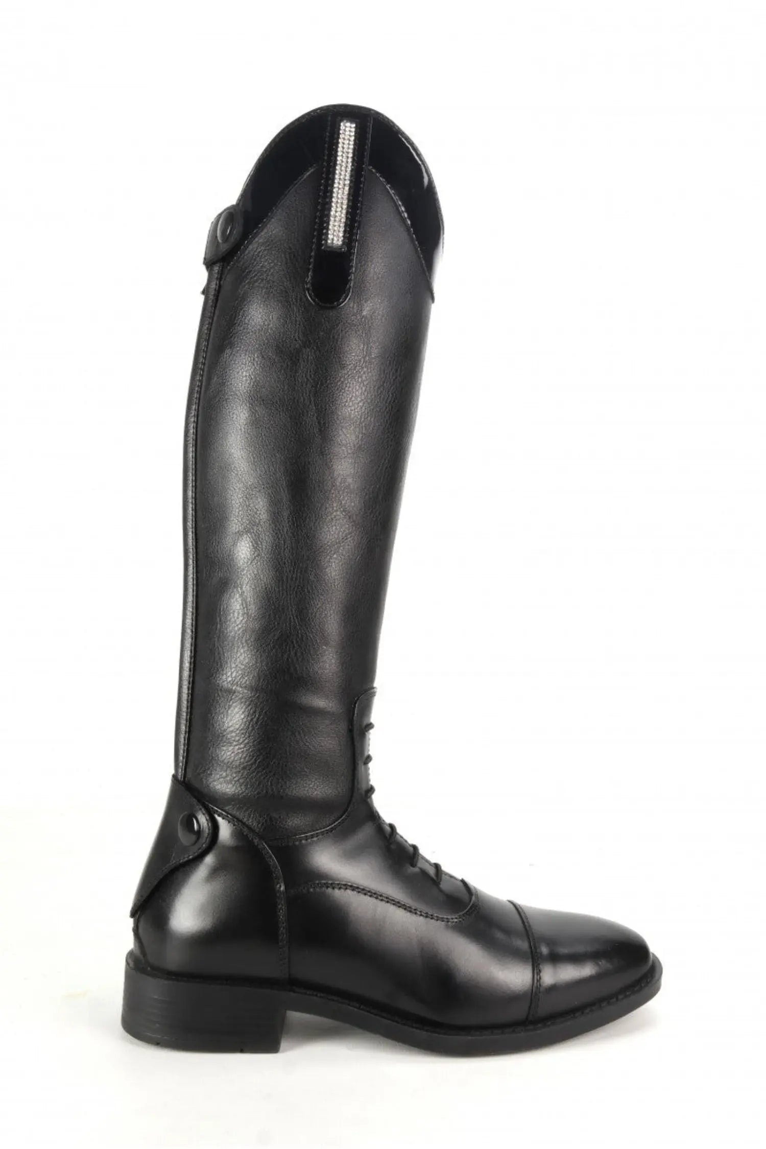 The Brogini Kids Como Piccino Patent Top Long Field Boots have been designed for a comfortable, close to leg fit. They feature a patent leather top with a delicate row of diamantes that give them an added bit of sparkle. The Brogini Kids Como Piccino Patent Top Long Field Boots are made with genuine soft leather for the foot and inside leg panel which helps improves grip whilst riding and a stretchy synthetic leather calf section that creates a snug well fitting boot. With a zip fastening to the rear and elasticated laces to the front.