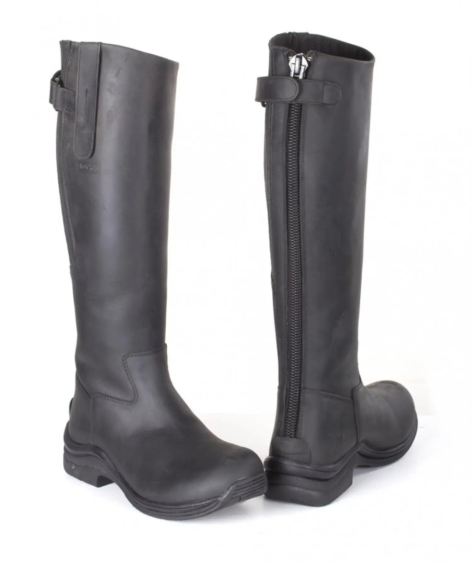 The Toggi Carlton Riding Boot is the children's version of the best selling Toggi adult Calgary Riding Boot. The Calrton is a stylish, practical long leather riding boot that is versatile and comfortable enough for everyday wear as a country boot. Featuring a hard wearing leather upper, a tough YKK full length zip and a lightweight, non-slip PU rubber sole this boot is very durable and strong. The Carlton is water resistant to keep your feet dry and feature elasticated inserts for comfort and flexibility.