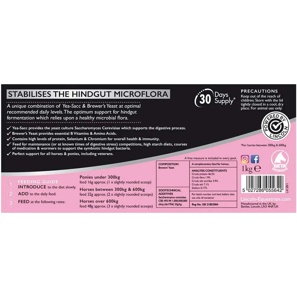 Yea-Sacc 30 contains a mixture of Yea-Sacc & Brewer’s Yeast. Yea-Sacc provides the yeast Saccharomyces Cerevisiae which supports the fibre digestion process, whilst the innovative inclusion of Brewer’s Yeast provides B vitamins & Amino Acids. Feed to maintain a healthy hindgut or give at known times of stress to support & stabilise the hindgut microflora. 30 day supply.