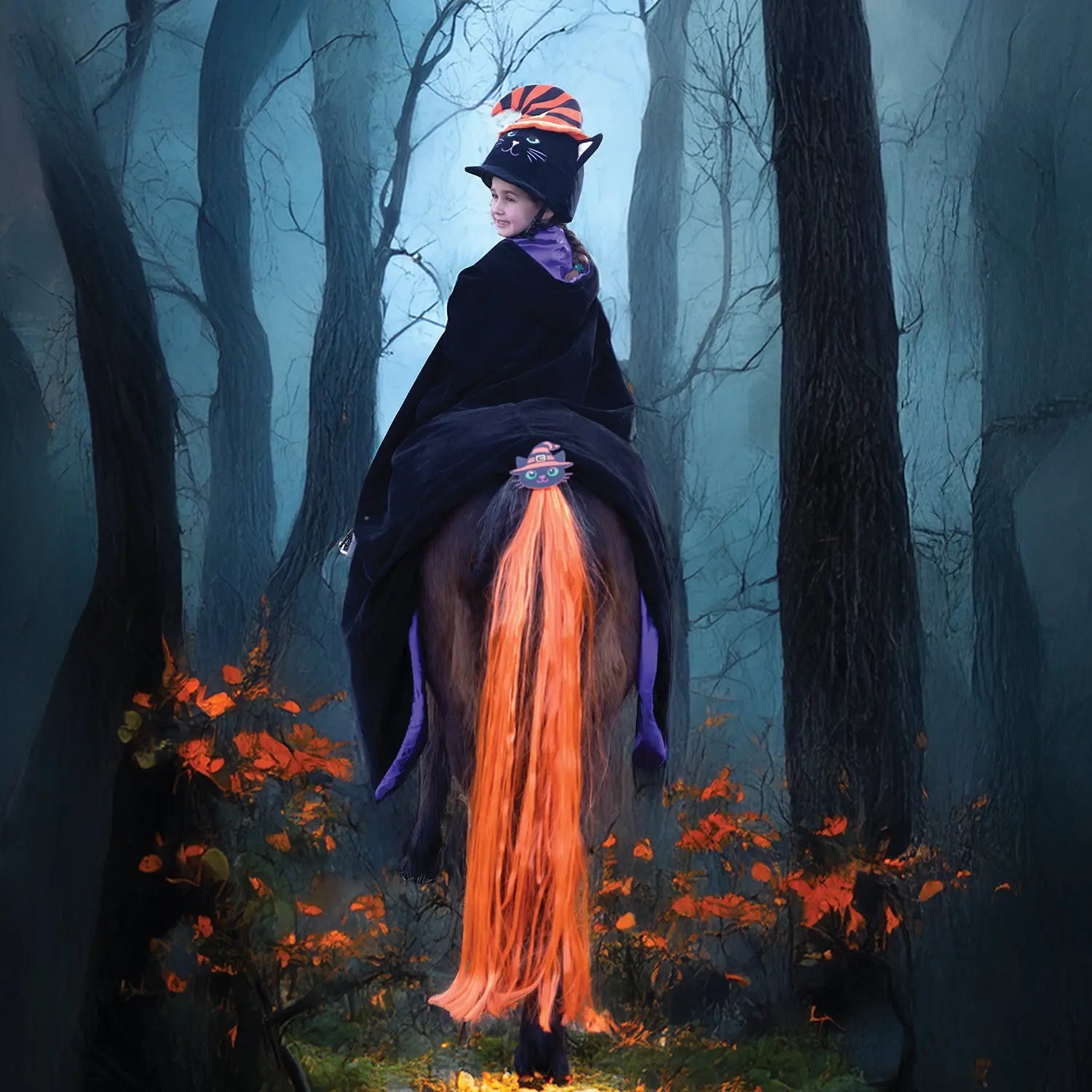 The tassels are made from high-quality, durable faux hair, with an elastic strap to ensure it stays securely in place throughout your ride. It is lightweight and easy to attach, making it a hassle-free addition to your horse’s Halloween wardrobe. The black cat charm not only adds a festive flair but also complements other spooky accessories, such as our matching Salem Hat Silk.