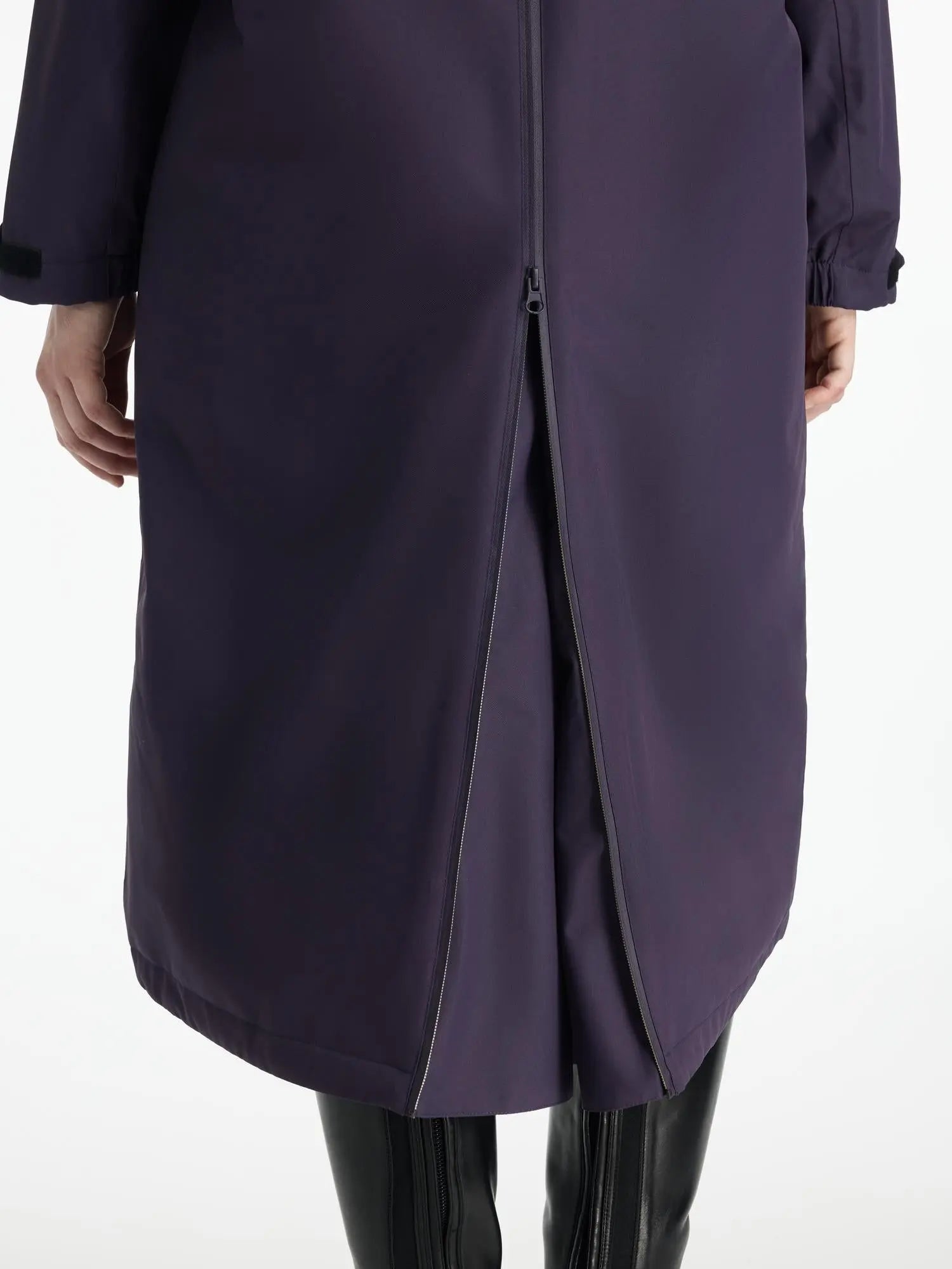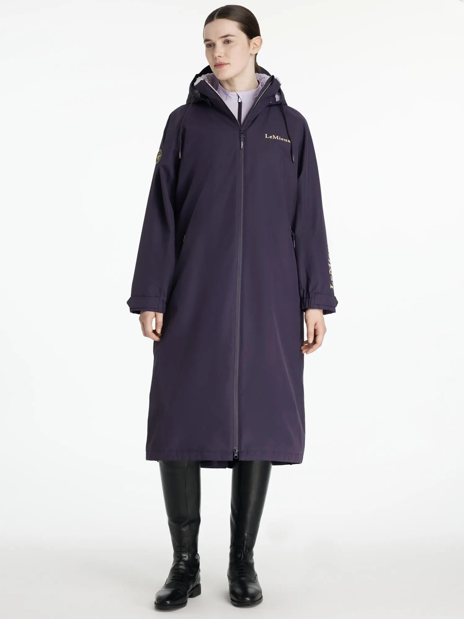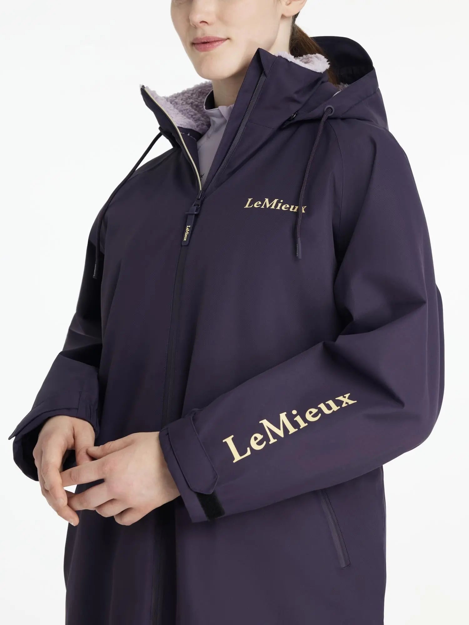 Shelter from the storm in this full-length, oversized, waterproof coat with a moisture-wicking fleece lining. Perfect for riding, changing and even running errands, it's big enough to throw on over clothing and cosy enough to dry off in. It's waterproof to 12,000mm with fully welded seams, inner storm cuffs, and a detachable hood. The breathable fabric has a 10,000mvp rating - ideal for working hard without overheating. There's plenty of pocket space for warming your hands and stashing treats in the deep zipped pockets. A two-way front zip gives you flexibility, while the back hem vent allows for fitting over the saddle. The PFC-free outer fabric is durable and ideal for life with horses. With statement LeMieux branding print and all the finishing touches you expect from LeMieux, this is the best way to stay dry - or dry off - on a wet ride.
