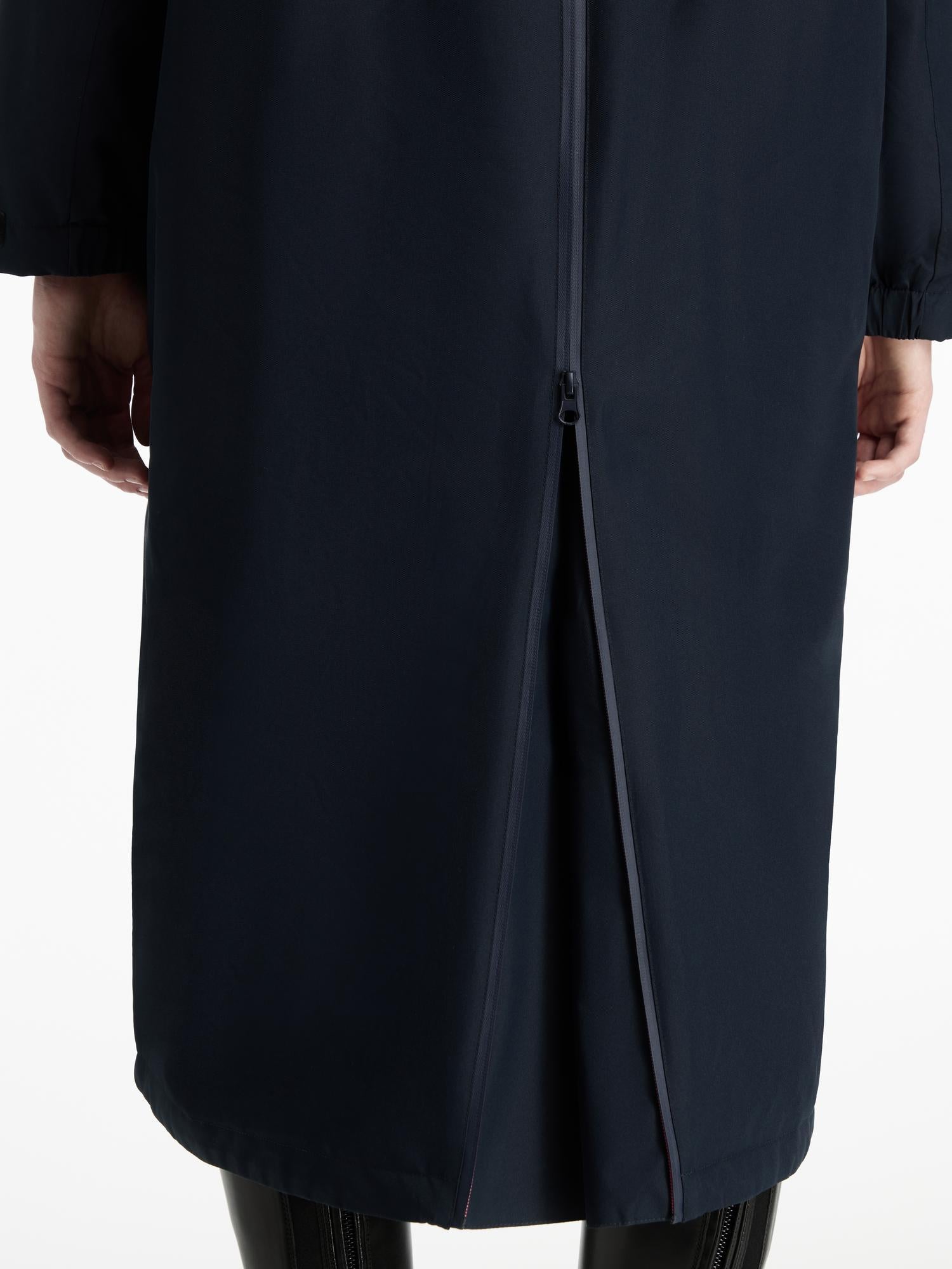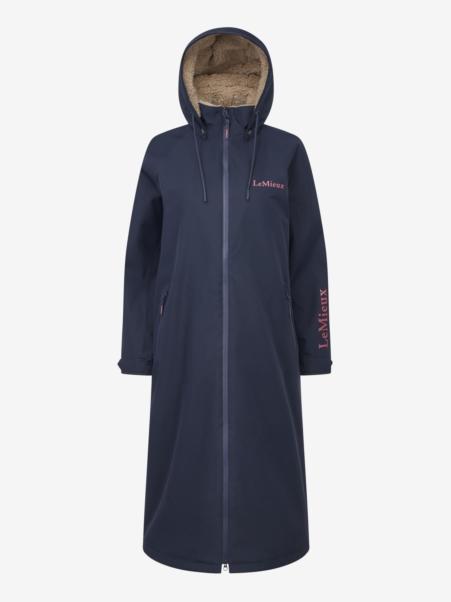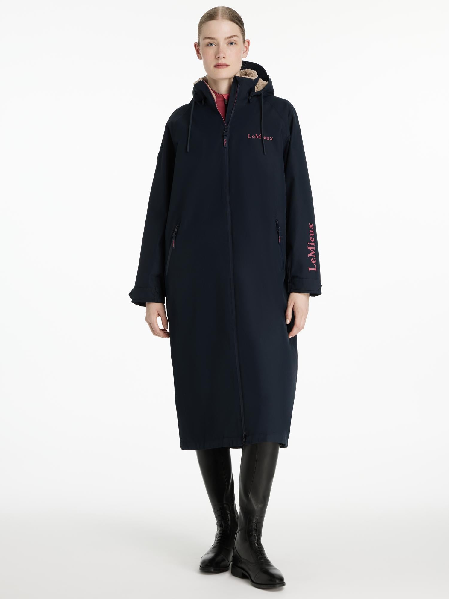 Shelter from the storm in this full-length, oversized, waterproof coat with a moisture-wicking fleece lining. Perfect for riding, changing and even running errands, it's big enough to throw on over clothing and cosy enough to dry off in. It's waterproof to 12,000mm with fully welded seams, inner storm cuffs, and a detachable hood. The breathable fabric has a 10,000mvp rating - ideal for working hard without overheating. There's plenty of pocket space for warming your hands and stashing treats in the deep zipped pockets. A two-way front zip gives you flexibility, while the back hem vent allows for fitting over the saddle. The PFC-free outer fabric is durable and ideal for life with horses. With statement LeMieux branding print and all the finishing touches you expect from LeMieux, this is the best way to stay dry - or dry off - on a wet ride.