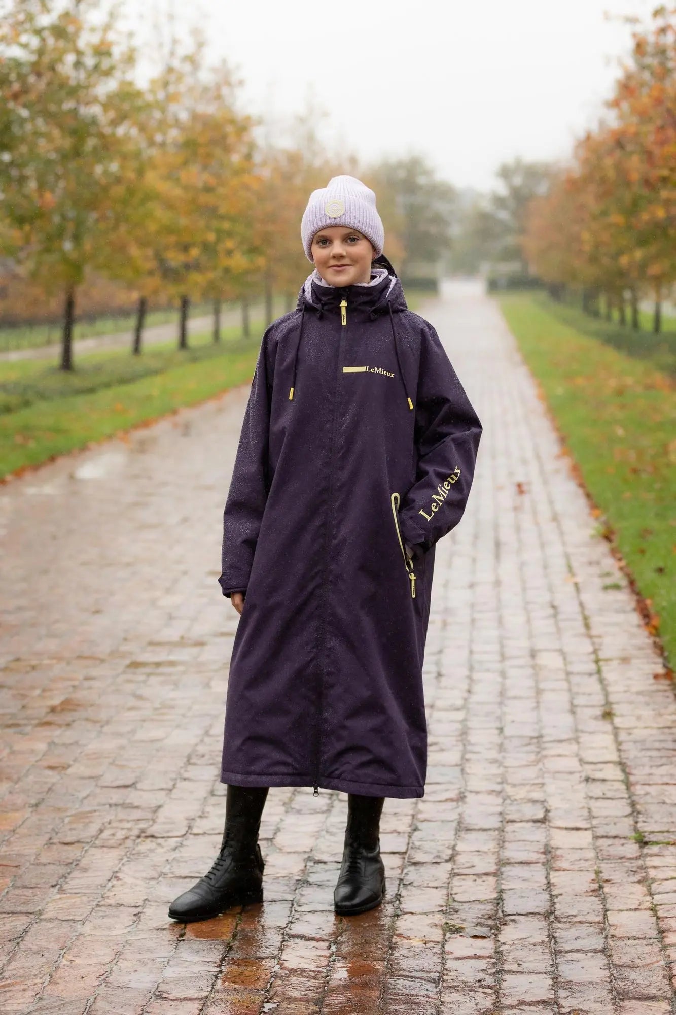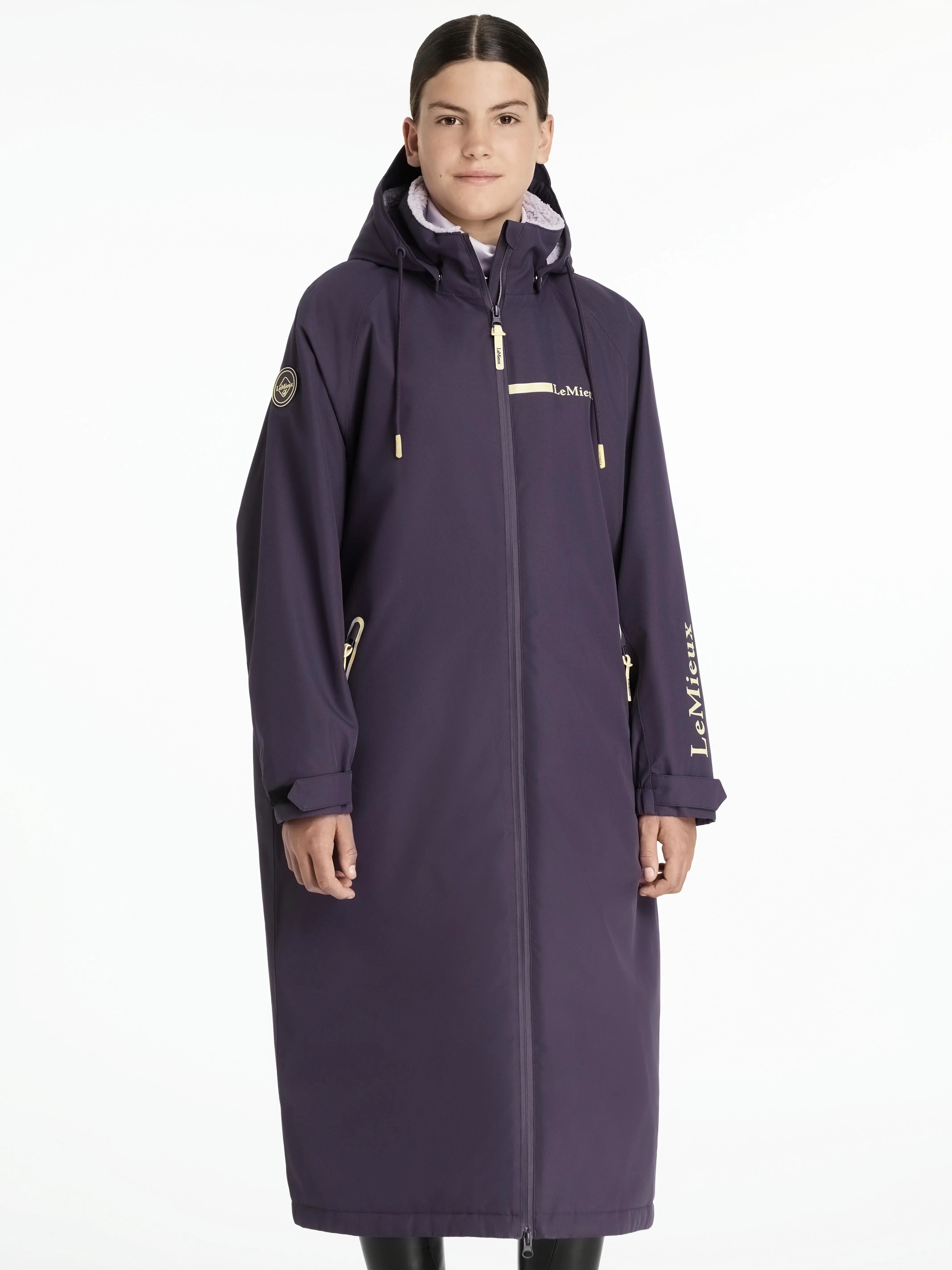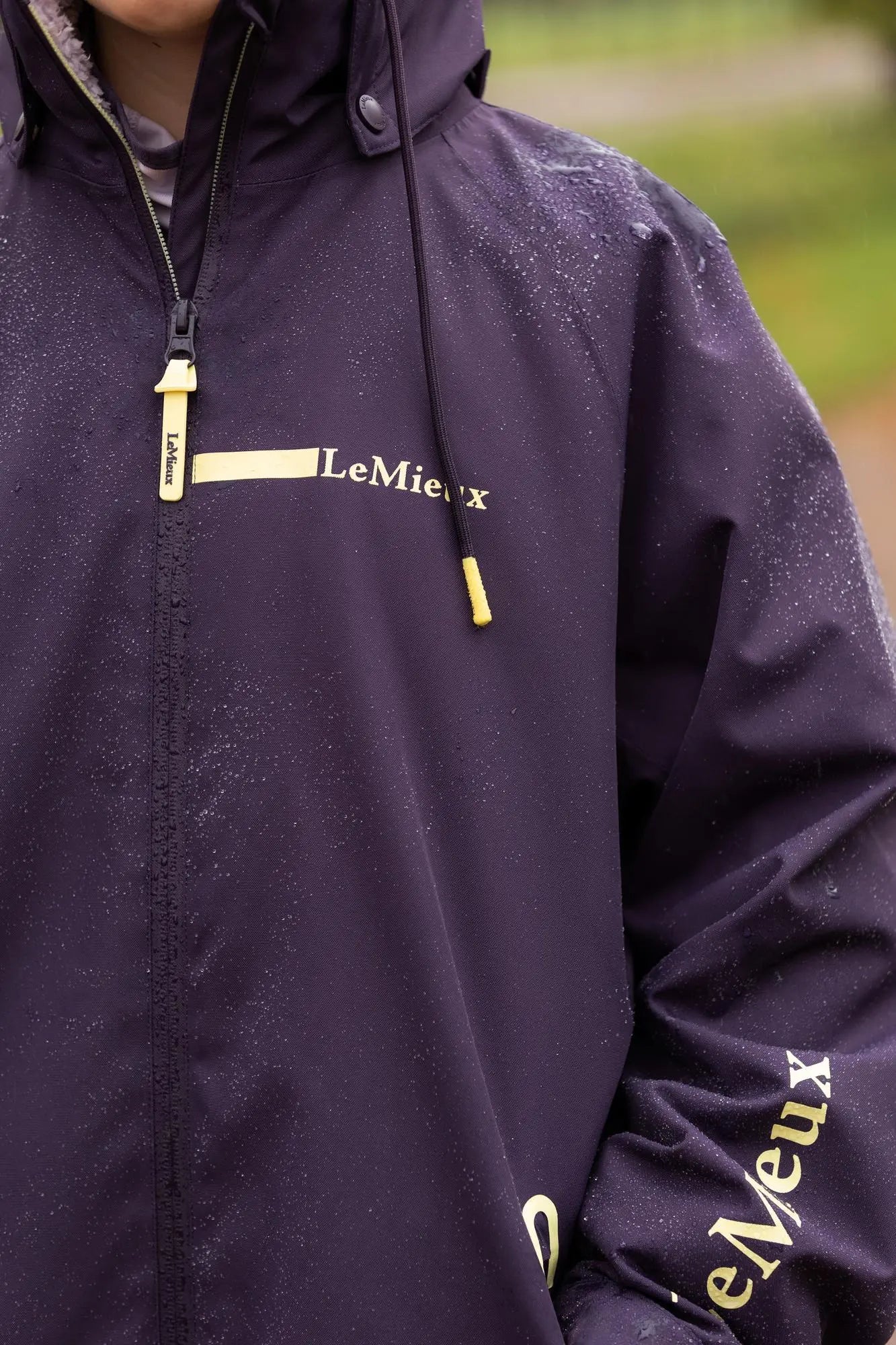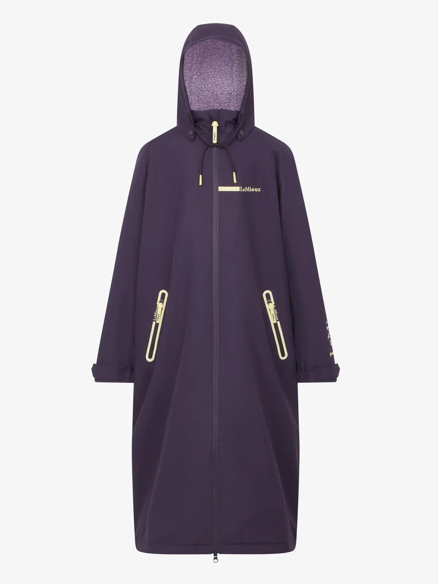 Shelter from the storm in this full-length, oversized, waterproof coat with a moisture-wicking fleece lining. Perfect for riding, changing and even running errands, it's big enough to throw on over clothing and cosy enough to dry off in. It's waterproof to 12,000mm with fully welded seams, inner storm cuffs, and a detachable hood. The breathable fabric has a 10,000mvp rating - ideal for working hard without overheating. There's plenty of pocket space for warming your hands and stashing treats in the deep zipped pockets. A two-way front zip gives you flexibility, while the back hem vent allows for fitting over the saddle. The PFC-free outer fabric is durable and ideal for life with horses. With statement LeMieux branding print and all the finishing touches you expect from LeMieux, this is the best way to stay dry - or dry off - on a wet ride.