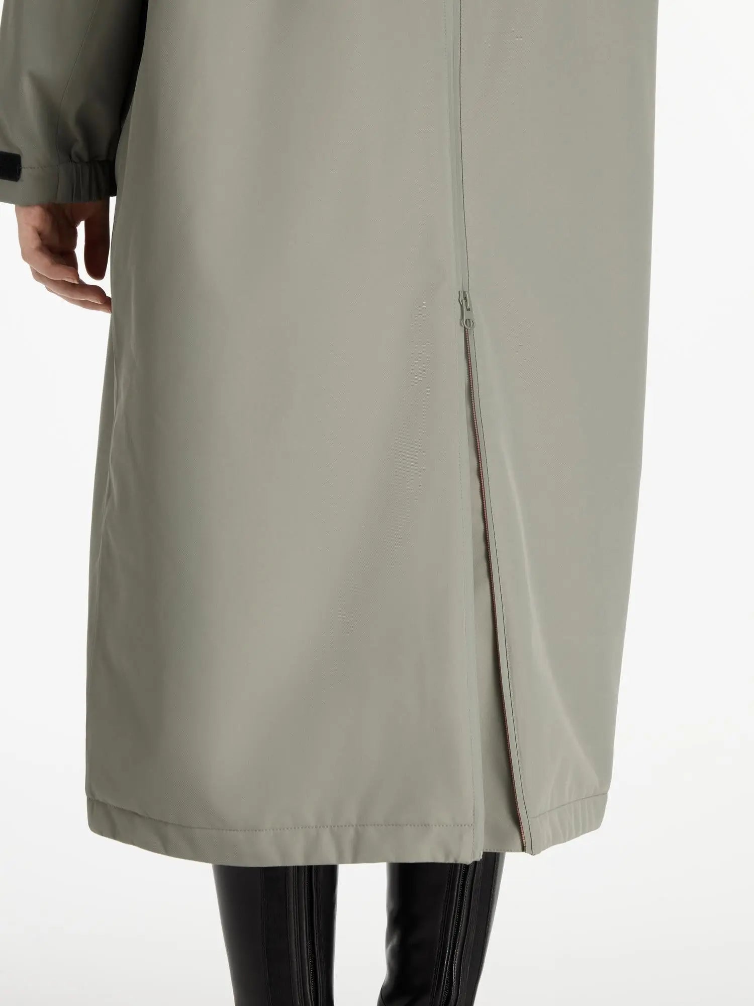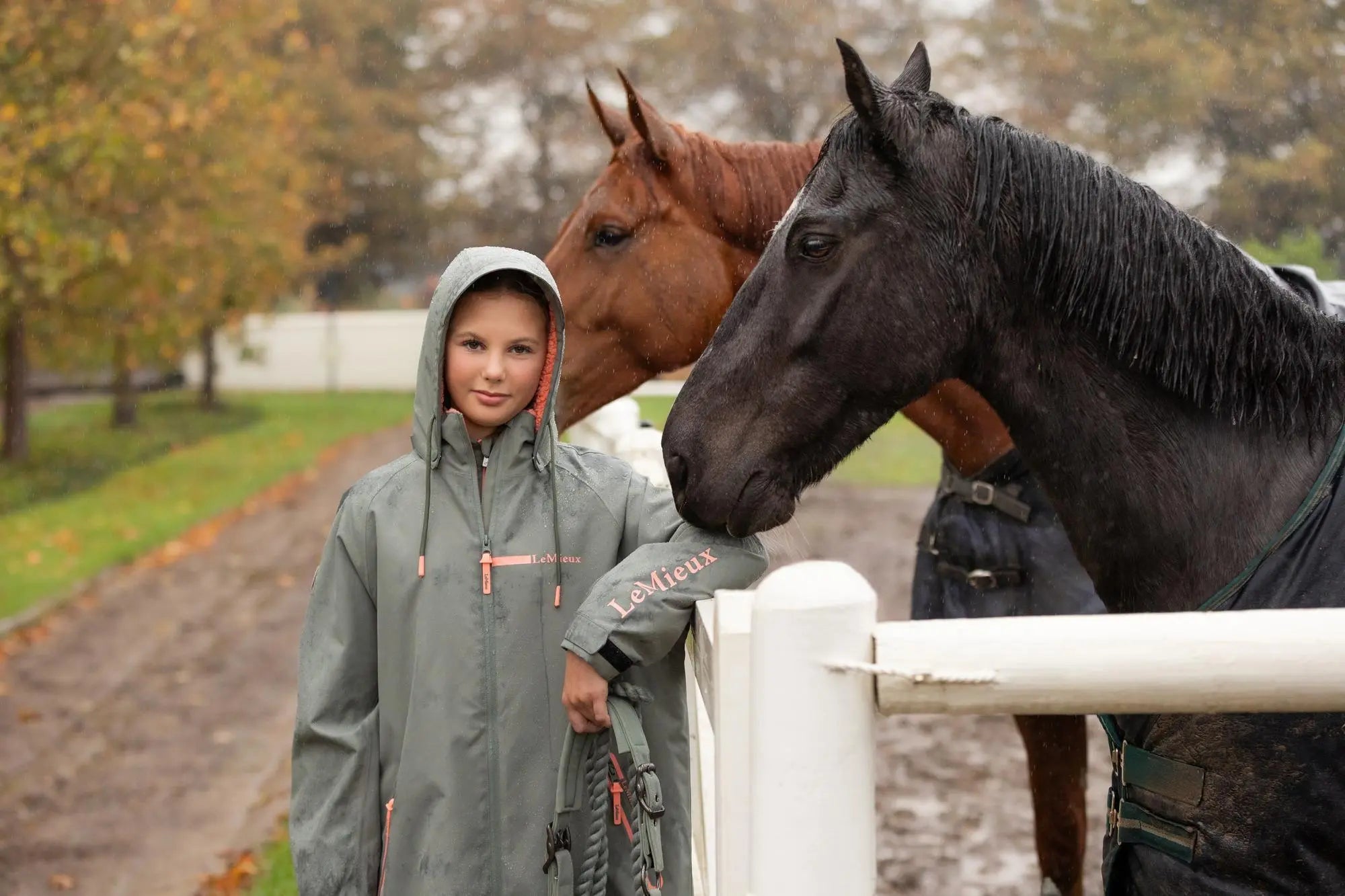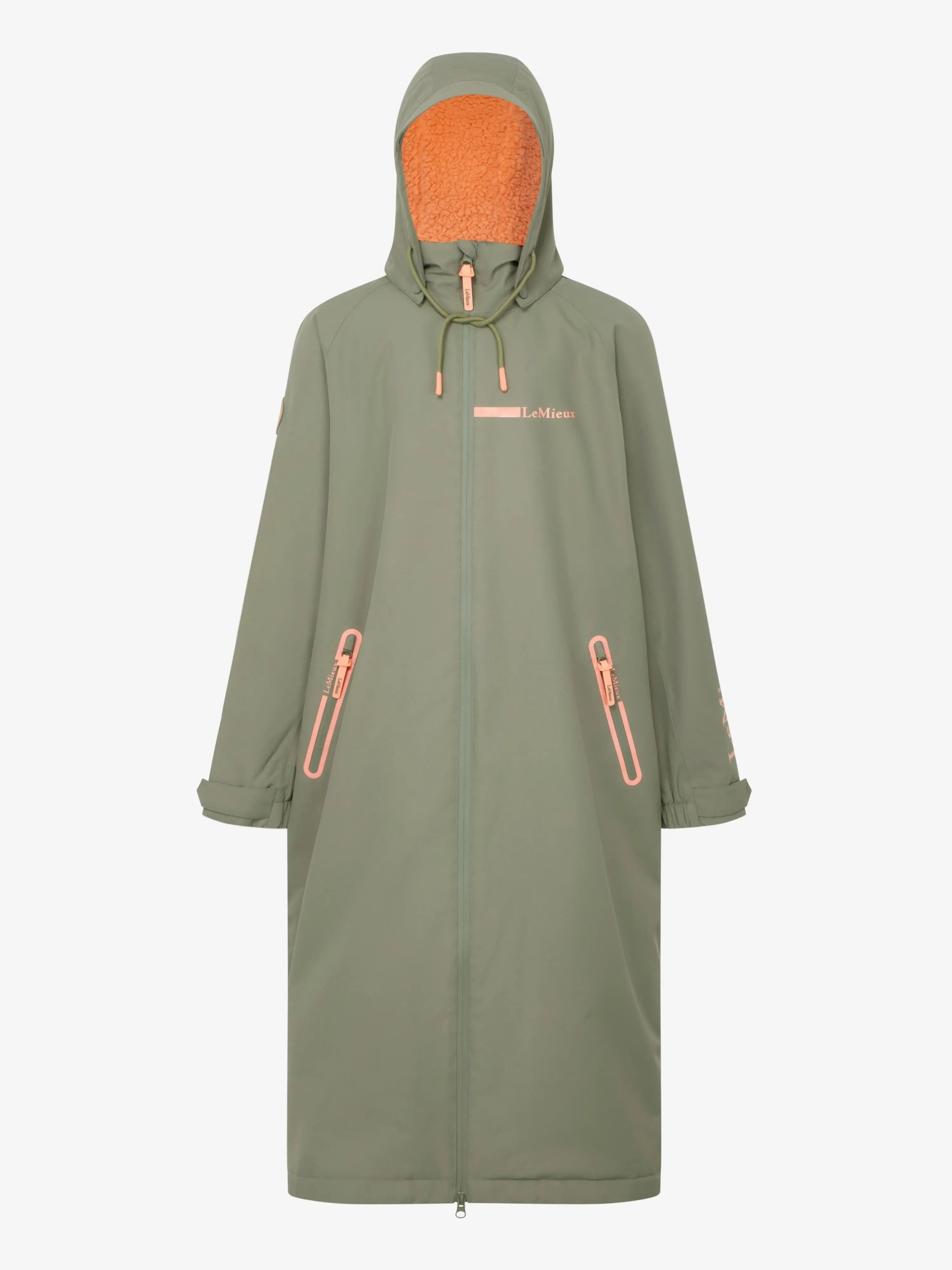 Shelter from the storm in this full-length, oversized, waterproof coat with a moisture-wicking fleece lining. Perfect for riding, changing and even running errands, it's big enough to throw on over clothing and cosy enough to dry off in. It's waterproof to 12,000mm with fully welded seams, inner storm cuffs, and a detachable hood. The breathable fabric has a 10,000mvp rating - ideal for working hard without overheating. There's plenty of pocket space for warming your hands and stashing treats in the deep zipped pockets. A two-way front zip gives you flexibility, while the back hem vent allows for fitting over the saddle. The PFC-free outer fabric is durable and ideal for life with horses. With statement LeMieux branding print and all the finishing touches you expect from LeMieux, this is the best way to stay dry - or dry off - on a wet ride.