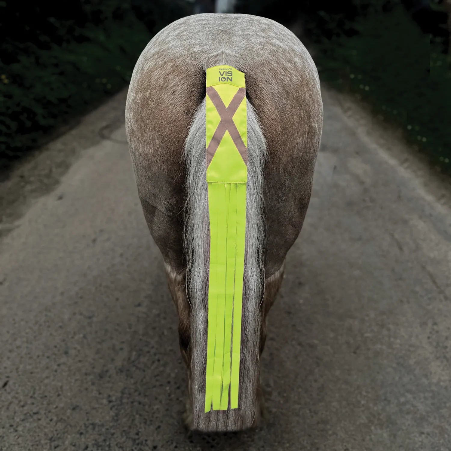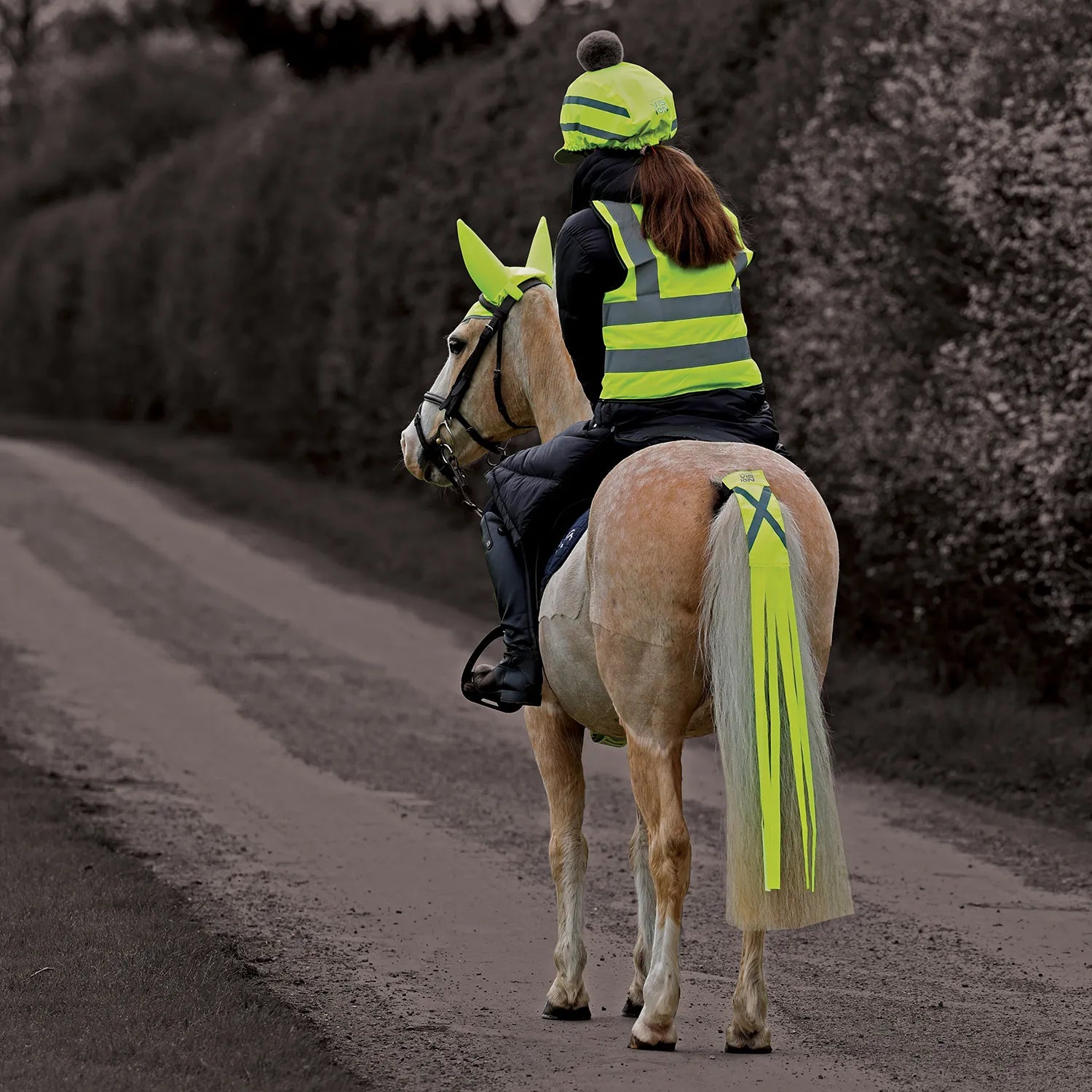 With the new Equetech HI-Vis Collection, safety and visibility are always a priority when riding or leading horses! The Equetech Hi-Vis Vision Horse Tail Tassels are styled in bright fluorescent fabric with a reflective Equetech Vision logo and bold graphics to enhance your horse's visibility to other road users. Distinctive highlights of these horsetail tassels include strategically placed reflective panels that significantly increase visibility, especially in low-light conditions, and an elastic panel that ensures a secure and comfortable fit. The silicone grip prevents the tassels from slipping or becoming tangled during movement. A superb road safety accessory for alerting motorists and other road users to the presence of horses, giving others valuable seconds to spot and slow down when approaching your horse. Be seen, be bright and bold! One size fits all. Machine washable.