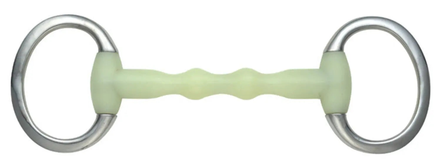 The Shires EquiKind Ripple Eggbutt Snaffle is a flexible, lightweight mouthpiece offering the same qualities as rubber with improved flexibility. This bit is an ideal choice for younger horses or those who are adverse to metal as the EquiKind material is warmer and softer in the mouth, encouraging acceptance. This bit material is also apple flavoured for palatability.