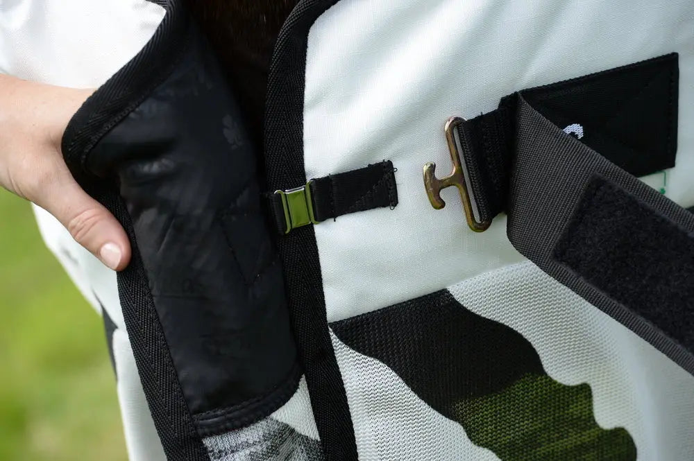 The design of this rug includes a new integrated neck and a waterproof upper to give the horse full protection from both fly bites and rain. The entire rug is breathable which helps to minimise sweating, whilst the white sun reflective upper helps to reflect the sunlight away from the horse, helping to keep them cool and comfortable all day long. The Zebra Rain Rug has a mesh lining underneath the reflective material which helps with the flow of air under the rug, keeping the body cool even in hot weather. A built in tail flap also helps to keep flies away from the horses tail, and can offer a higher level of protection from bites.