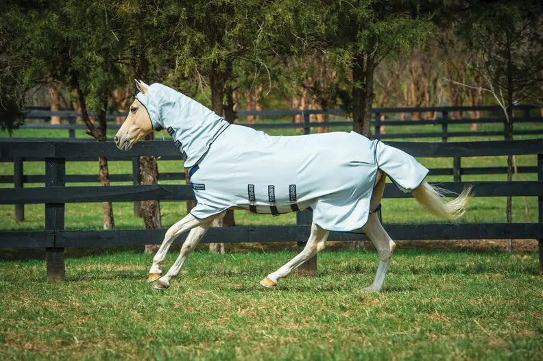 The Rambo® Pony Hoody is a high-performance fly rug designed to protect ponies from flies, UV rays, and summer skin irritations. Made from strong yet soft 1000D polyester with a close-weave mesh, it blocks even the tiniest biting insects while remaining lightweight and breathable. It offers 90% UV protection and full coverage with an integrated neck cover, extended belly flap, and generous tail flap. Comfort features include a V-front closure, dual leg arches for movement, and silky linings to prevent rubbing. Compatible with a waterproof fly liner, this rug is ideal for unpredictable UK weather and sensitive ponies alike.