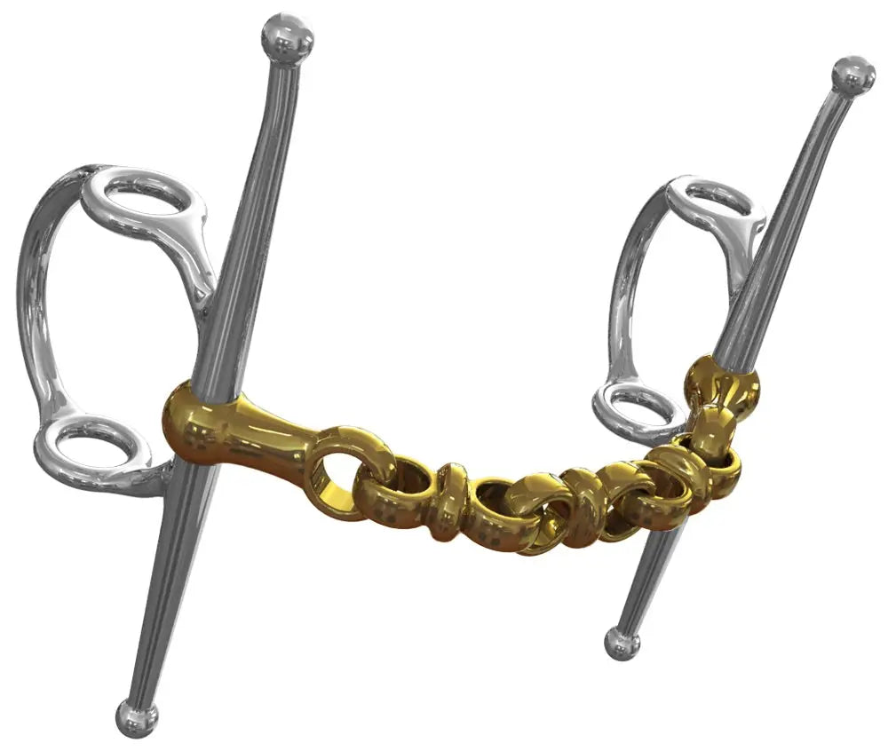 Worn with running gag cheeks this bit has a two rein option, allowing the rider to have varying degrees of control depending on the circumstances. The rider can differenciate between the snaffle rein and the running cheek which provides poll pressure. The running cheek rein maximises control and lift from the shoulder.