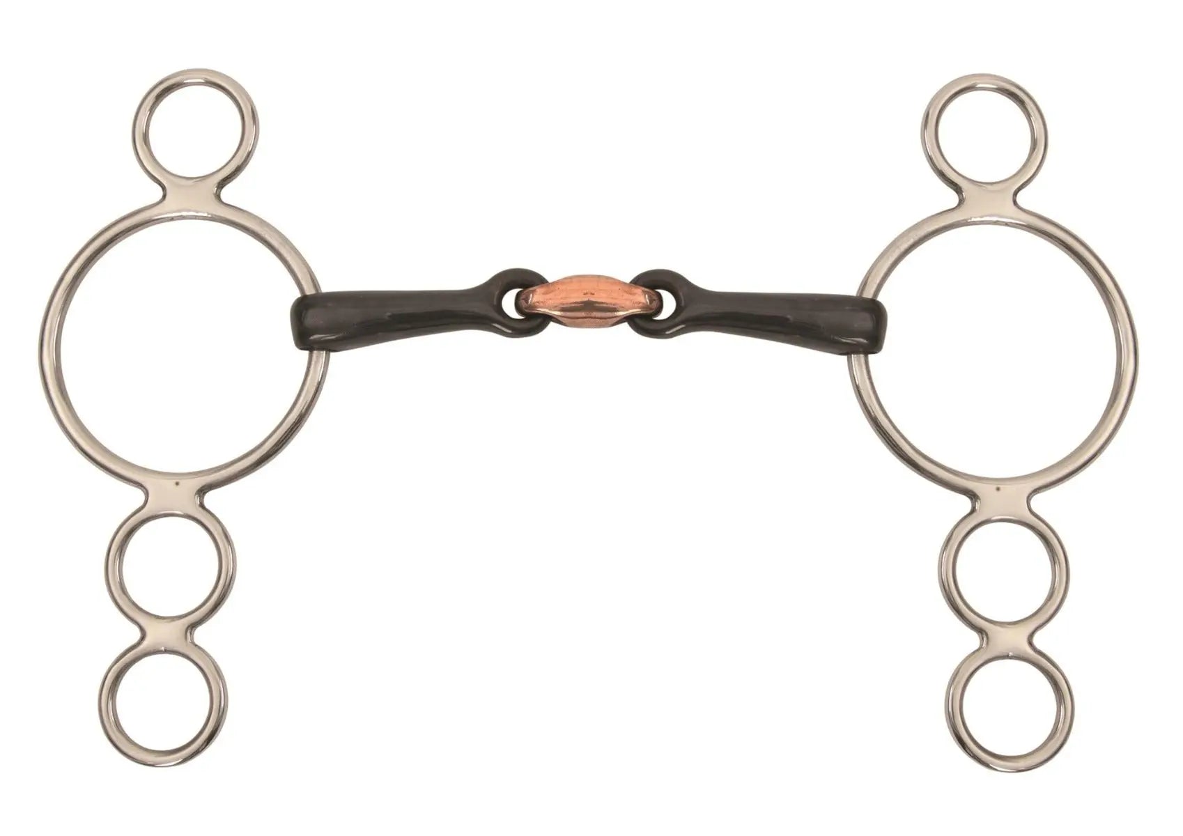 The Shires Three Ring Dutch Gag with Lozenge bit has a copper lozenge, the lozenge helps to add warmth along with this the bit also has raised copper ribs.