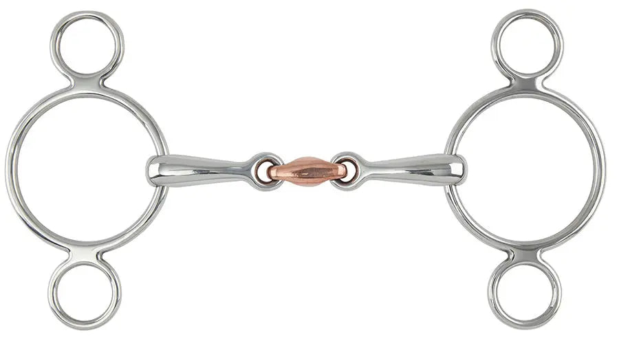 The Shires Two Ring Copper Lozenge Gag Bit is available in widths 4.5" - 6".