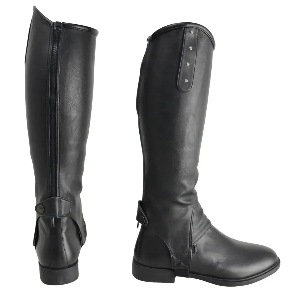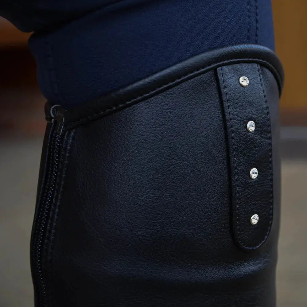 Add a touch of sparkle to your riding apparel! Our faux leather gaiters are designed to achieve the look of long boots, with diamante detailing on the top. Complete with a YKK zip fastening, secure press stud at the bottom and a reinforced elastic foot strap. This smart design incorporates a front panel to allow the gaiters to slide easily over jodhpur boots. These truly are the ultimate choice for the fashion-conscious equestrian who still wants a leading performance product.