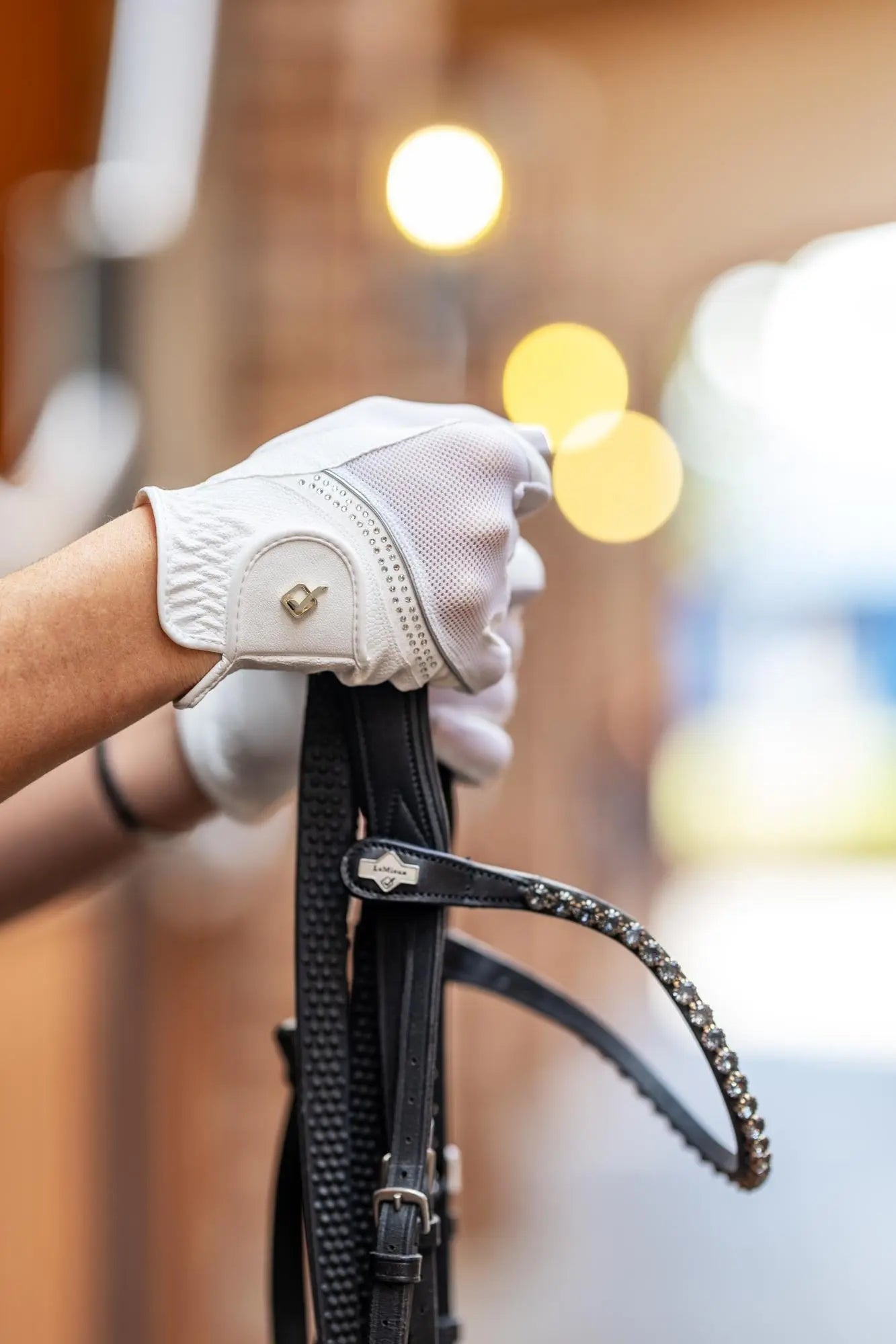 Eye-catching performance gloves to keep your hands cool when it counts, with breathable mesh panel design, excellent grip and secure hook and loop closures. Sophisticated crystal decoration elevates these gloves for a special competition day look.
