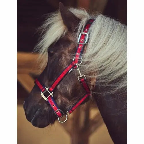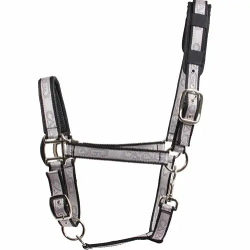 High quality soft webbed halter with woven logo effect. Perforated effect SympaTex padding creates an imitation leather-look while adding desirable cushioning. Detachable waffle Neoprene poll pad on head piece for versatile placement and cleaning options. Adjustable nose band and head piece to fit a variety of head sizes. Rich hardware.