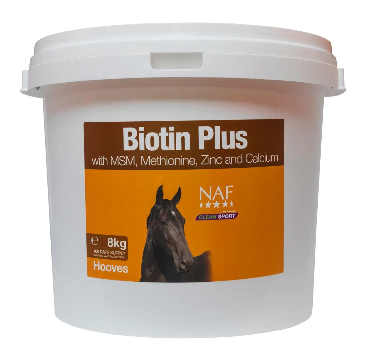 NAF Biotin Plus contains methionine, MSM, zinc and calcium to maintain healthy hooves. Research shows that supplementary biotin is recommended for supporting hoof health. Biotin provides 15mg biotin daily, ideal for everyday maintenance of healthy hooves. Biotin Plus is ideal for everyday maintenance of healthy hooves