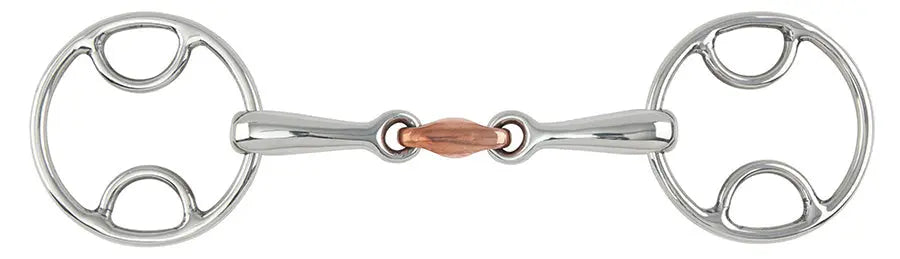 - Bevel cheeks give a mild lever action, offering the rider slightly more control- Loose bit rings allow the bit to move inside the mouth, preventing the horse from fixing or taking a hold- The size of the bit rings increase with the size of the bit, to keep the rings in proportion with the horse's face- The double jointed 16mm mouthpiece features a copper lozenge which encourages salivation and acceptance of the bit