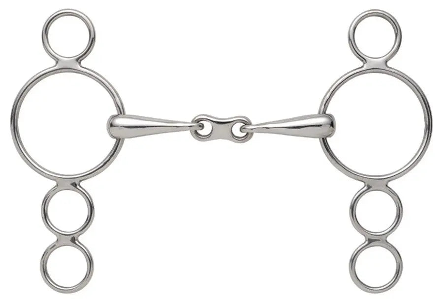 The Shires Dutch Gag with French Link is a french link bit, this means that the pressure from the bit is applied to both sides of the horses tongue. The Shires Dutch Gag with French Link may be useful for horses with low palates as it may be more comfortable for them as the mouthpiece should not come into contact with the palate when the bit is in action. The Shires Dutch Gag with French Link offers 3 rings, this offers leverage options to increase severity.