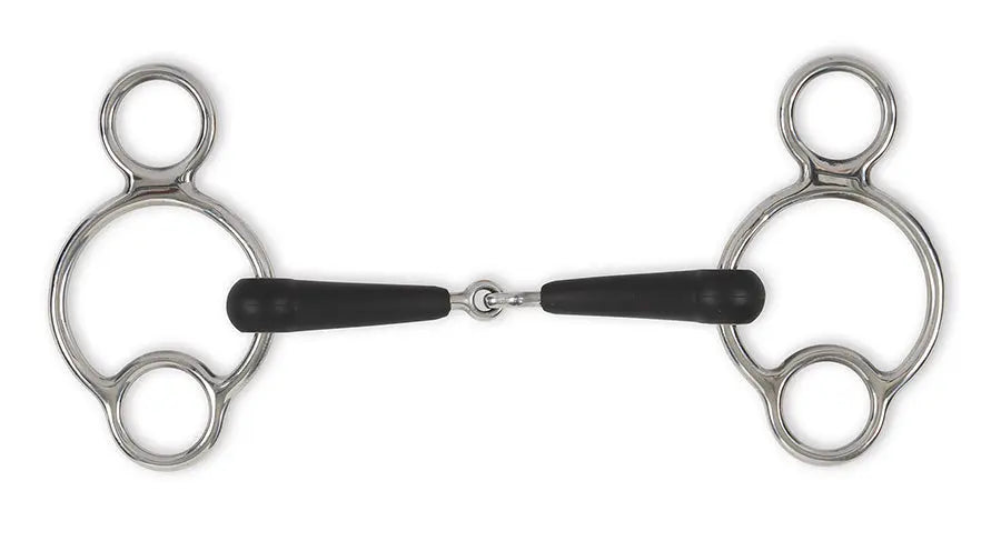 The single joint of this gag bit gives a nutcracker action on the tongue and bars of the mouth to help with control whilst the rubber covering can be useful for horses averse to metal.