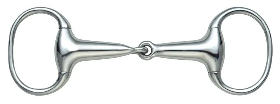 The Shires Hollow Mouth Eggbutt Snaffle is a single jointed snaffle designed with a fairly thick, hollow mouthpiece which is considerably lighter than a solid mouthpiece. This single jointed snaffle has a nutcracker action which works by applying pressure to the bars and tongue, allowing the rider to put more definite and precise pressure on either side of the bit. With an 21mm mouthpiece thickness, this bit is mild and can benefit horses with larger tongues as it has a greater contact area. Eggbutt cheeks are fixed, giving the bit more stability in the mouth and helping to aid steering - this may be more readily accepted by horses needing the security of a more stable bit.