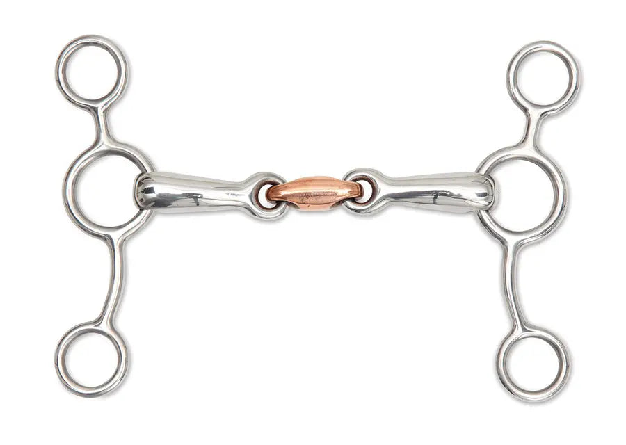 The Shires Tom Thumb with Copper Lozenge bit works by using pressure, the bit puts pressure on the horses poll and tongue. Attaching the reins of the bridle to the lower rings will increase the severity, the bit should be used with care.