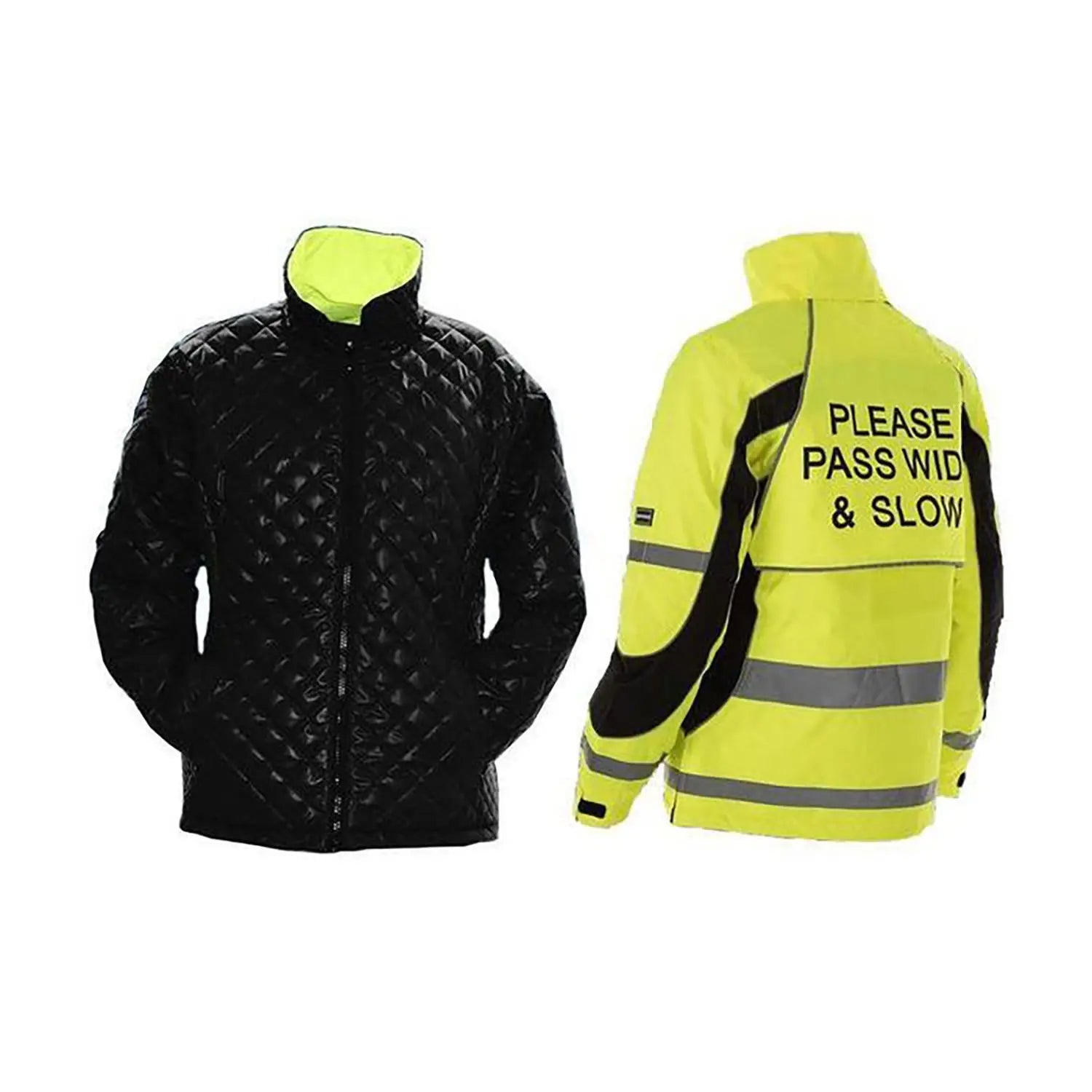 Two jackets for the price of one. One side is a stylishly tailored designed, hi-vis jacket with fluorescent and reflective detail for enhanced vision. When turned inside out. the jacket becomes a luxurious, black matt satin quilted jacket, with two sizes of quilting. Smaller quilted panels on the waist provide a slimming effect to the wearer.