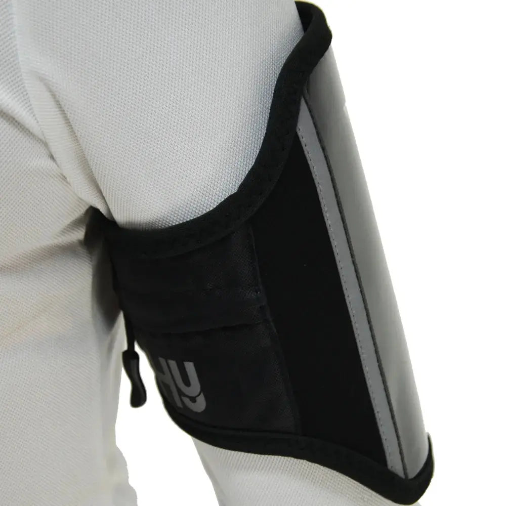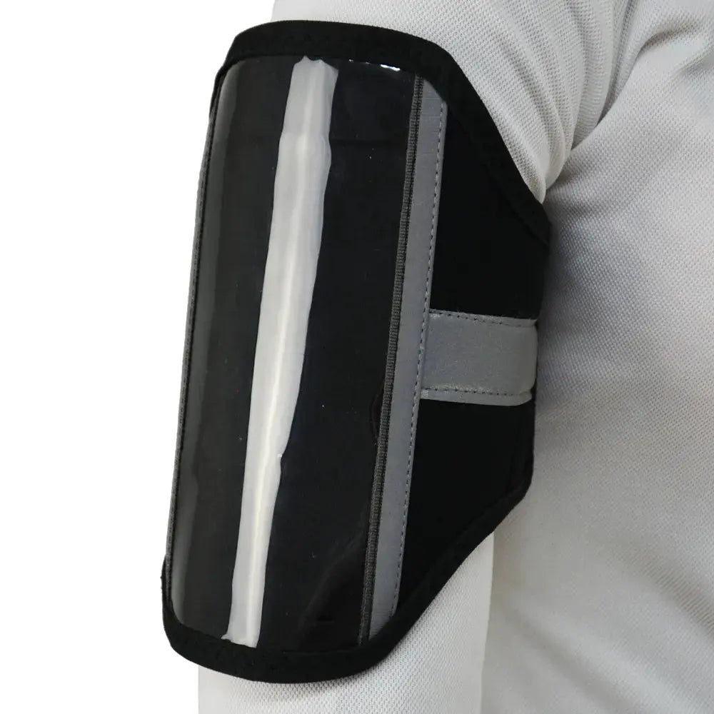 A reflective armband phone holder perfect for hacking out in or during other exercise. A touch tape fastening that is fully adjustable ensures the perfect fit around the arm and the neoprene fabric minimises rubbing and chafing on the arm. Large enough to fit the iPhone plus phones, this pocket has an easy slit opening to push the phone in. A specially designed water proof plastic cover protects the phone whilst enabling it to still be used in the pouch. The band also features a zip pocket for key storage and reflective strips for visibility.