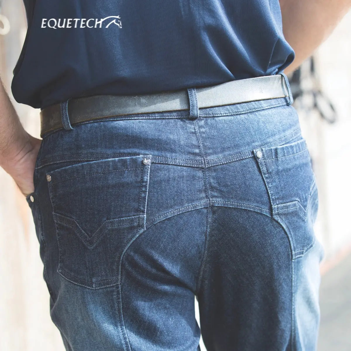 Designed to feel like your favourite jeans but with all the detail you would expect from a hard wearing pair of breeches. Features Equetech® silicone knee grips, front pleats, Lycra® leg panels to hem (no Velcro), jean style pockets, belt loops, and comfort waistband. Machine washable. Woven 95% Cotton/ 5% Lycra®