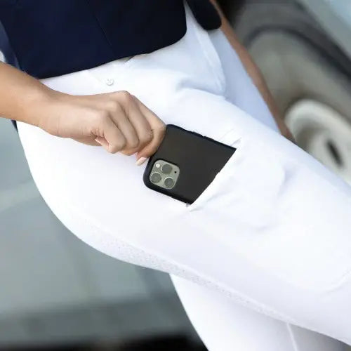These breeches incorporate a useful subtle phone pocket to the right thigh as worn, with careful seam positioning to the garment for ultimate comfort in and out of the saddle.