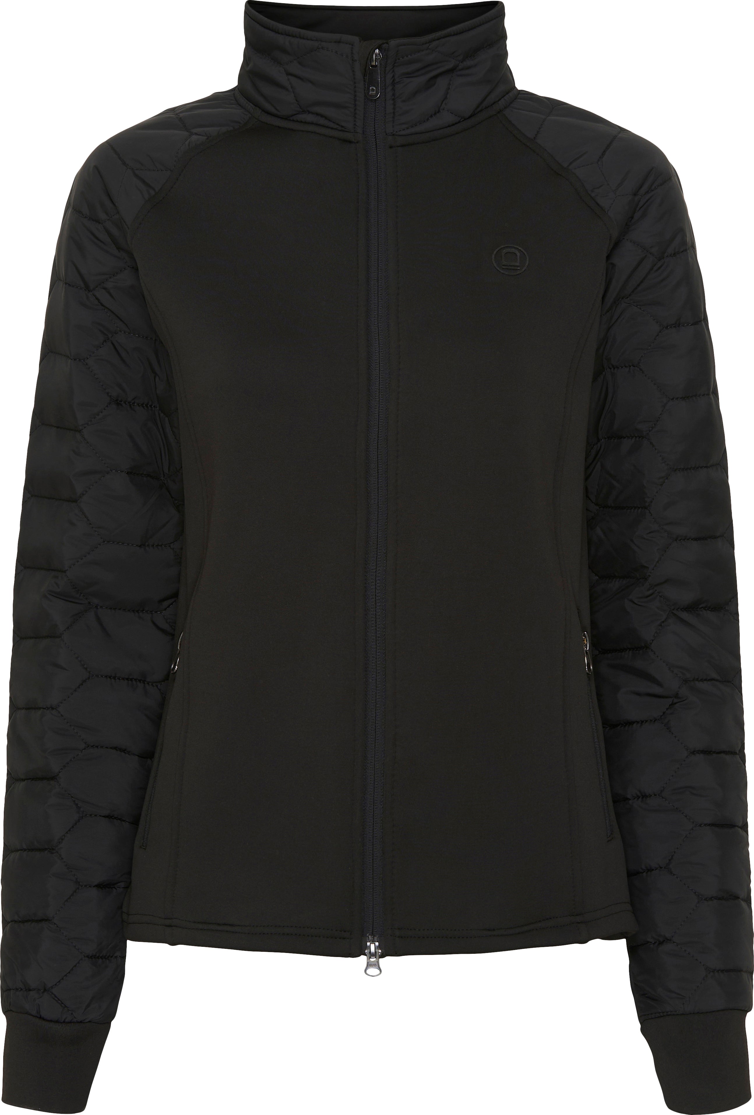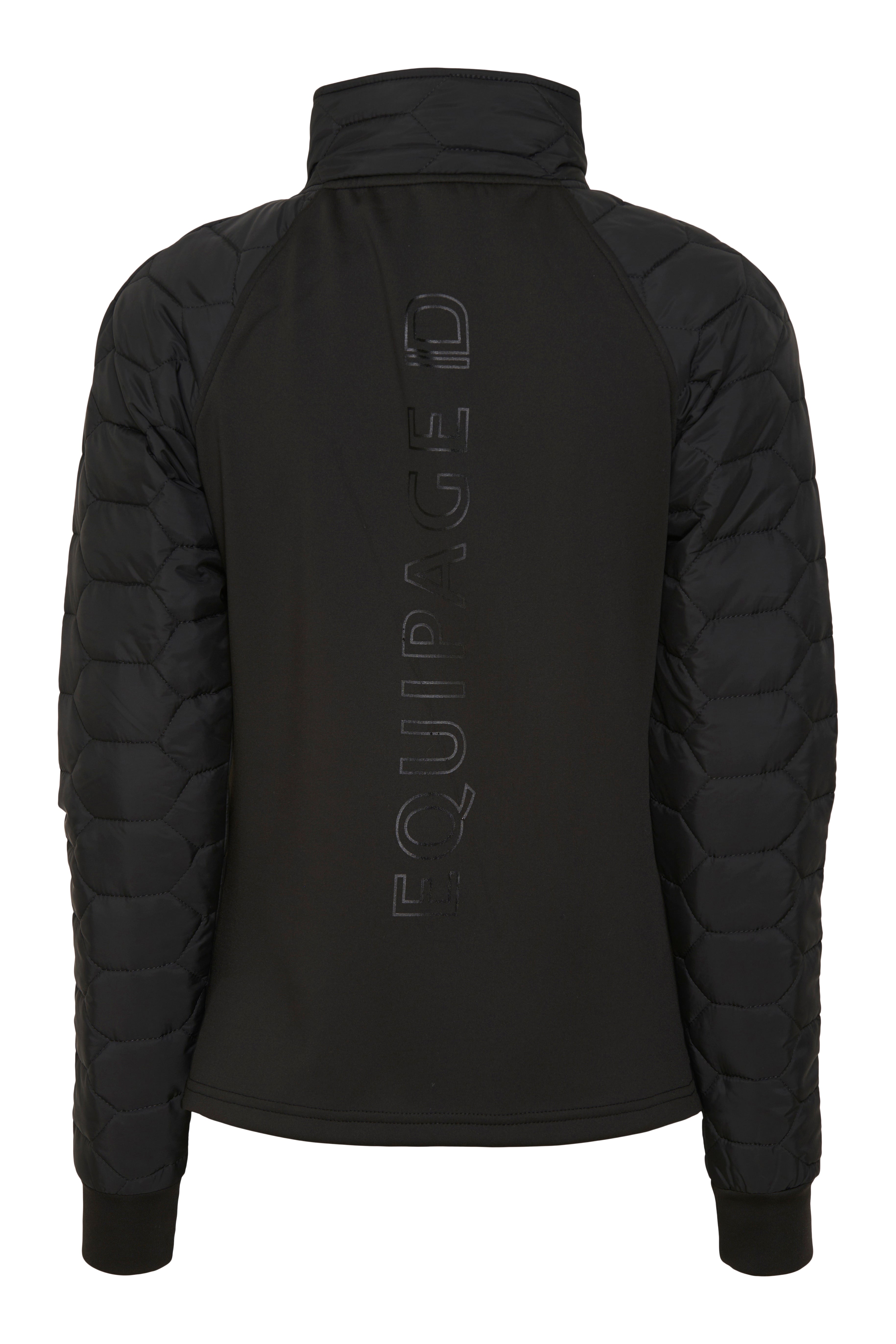 Sporty high neck cardigan with body and collar in a soft polyester with brushed backside. Lightly padded sleeves with hexagonal quilting finishing in ribbed cuffs. 2-way full-front zipper for maximum comfort. Two zipped front pockets. Small tonal stirrup logo at chest and big vertical EQUIPAGE tonal rubber-feel logo at back.