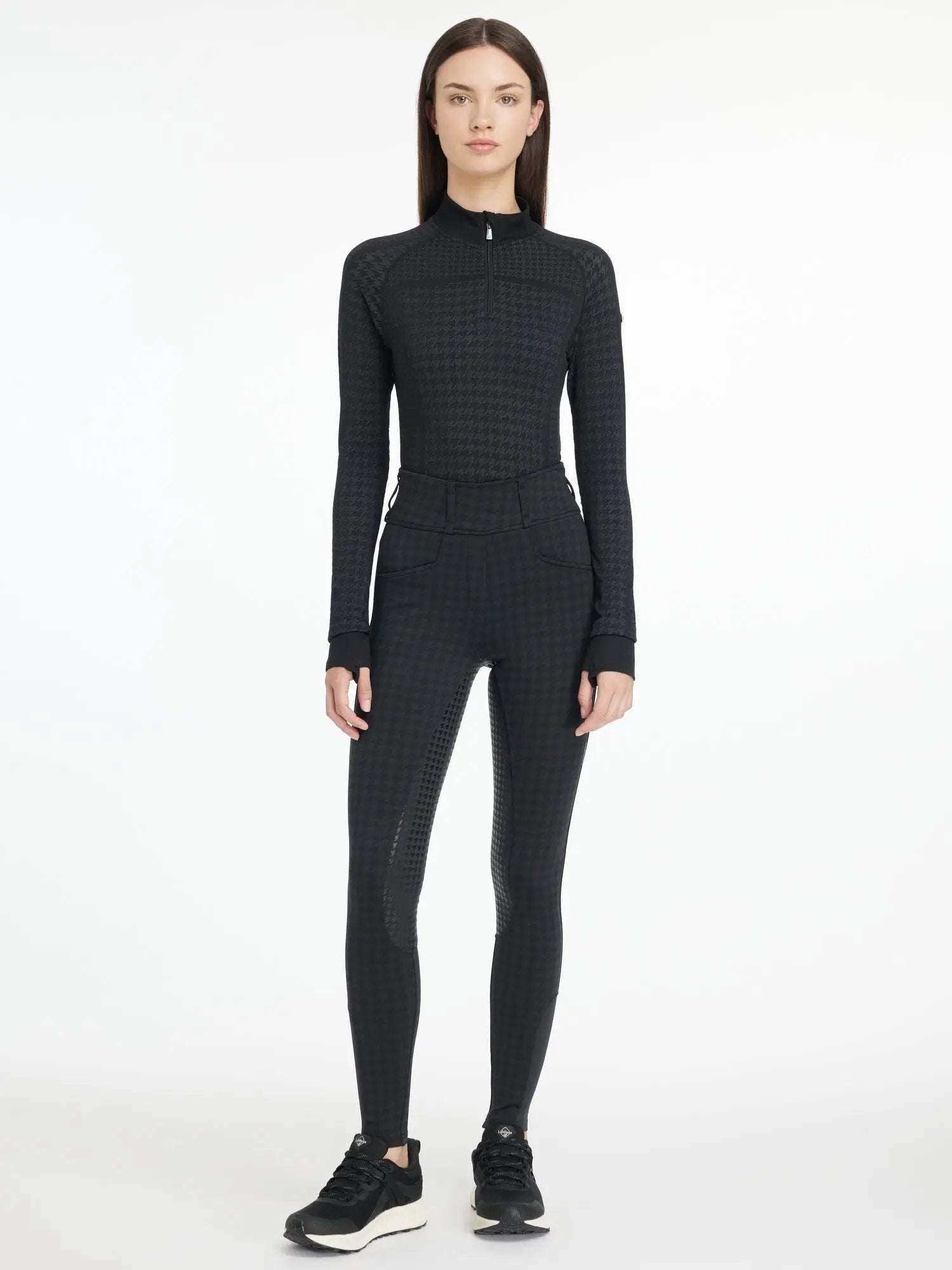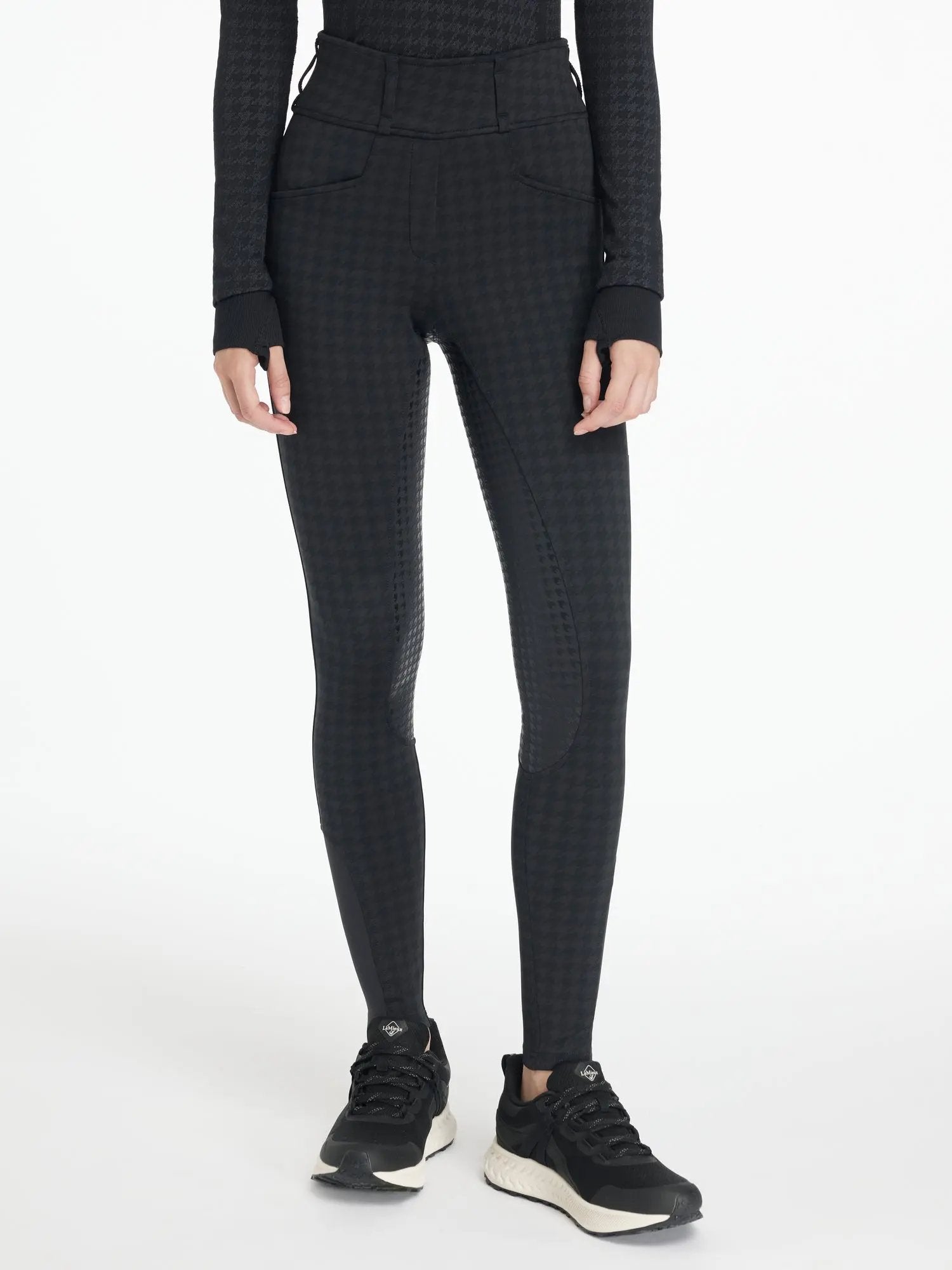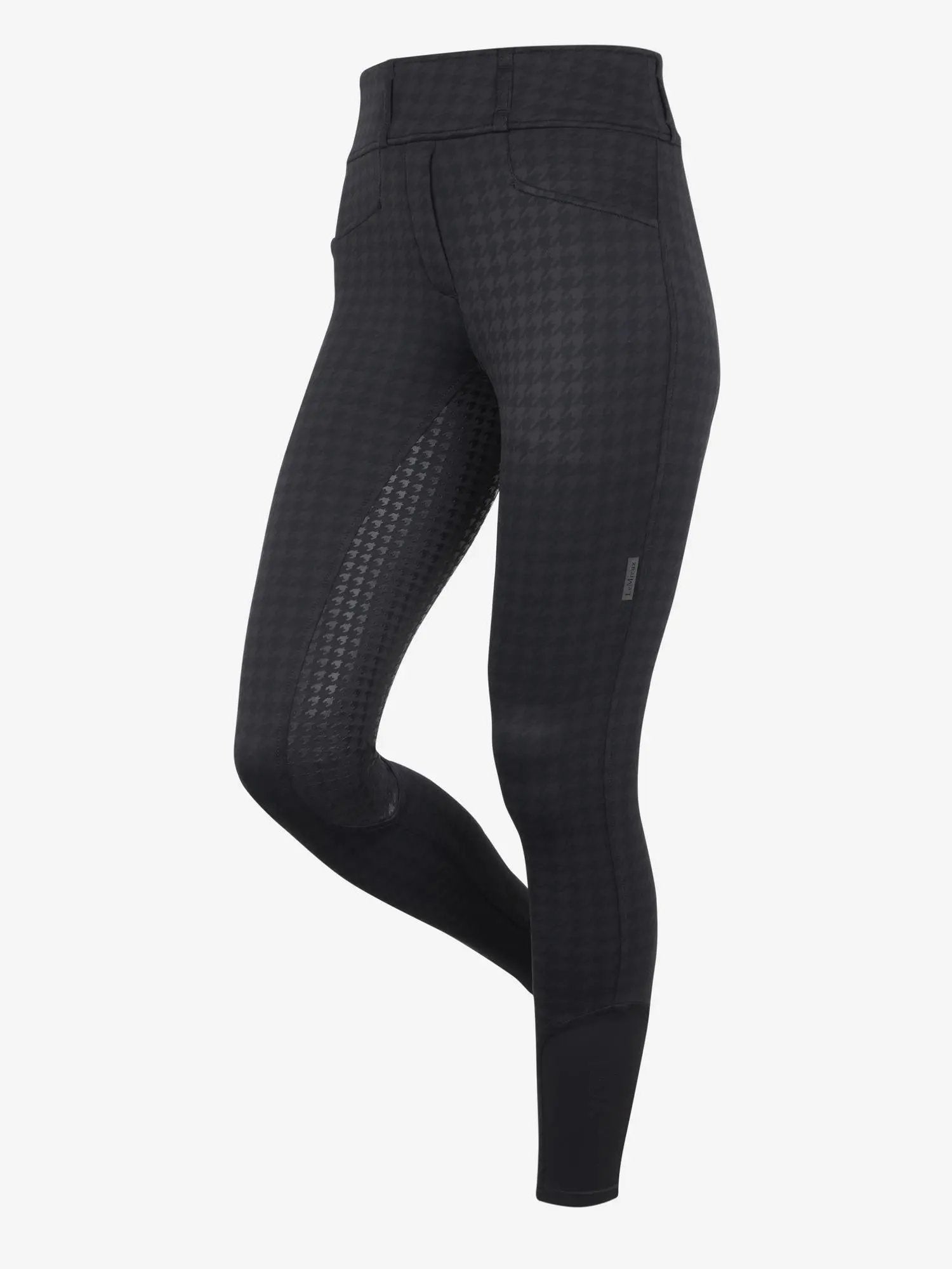 Conquer all your challenges in these stunning high-waisted breggings. They boast all the comfort of a legging, with the structure and finishing touches of breeches. The comfortably high waist cut features a criss-cross belt loop at the centre back. The houndstooth fabric is shaped for hold in all the right places, for flattering support where needed. Full-seat houndstooth print silicone offers grip for stability and security in the saddle. The LeMieux branded lower leg is laser cut to reduce bulk under boots.
