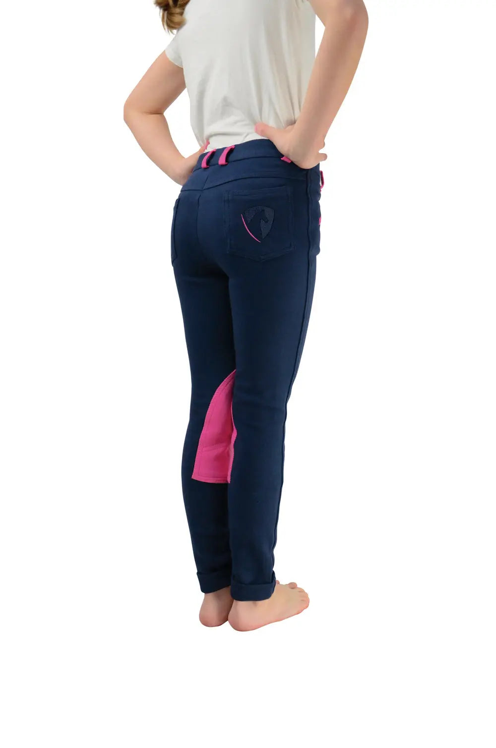 A durable, practical, everyday Jodhpur that is fashionable and flattering. Contrast knee patches and belt loops and the Hy Equestrian logo on the back pocket. Machine washable. Leg length: Regular.