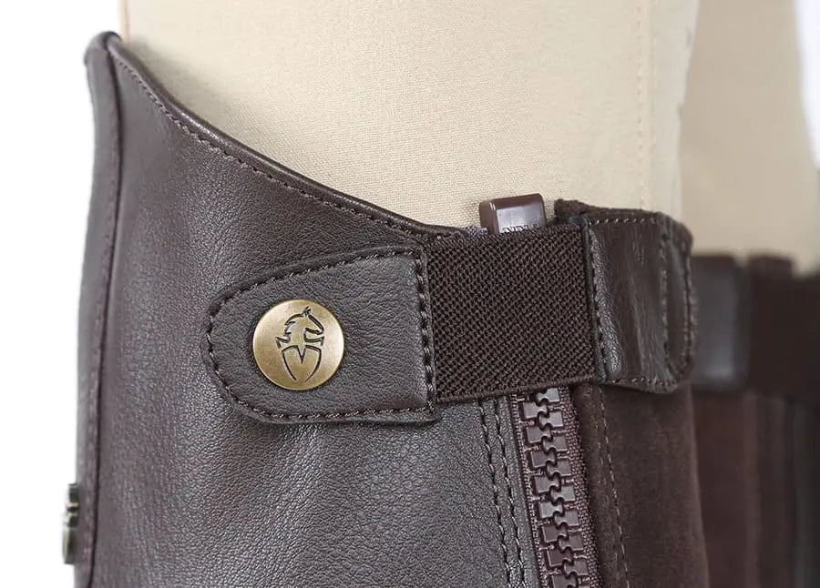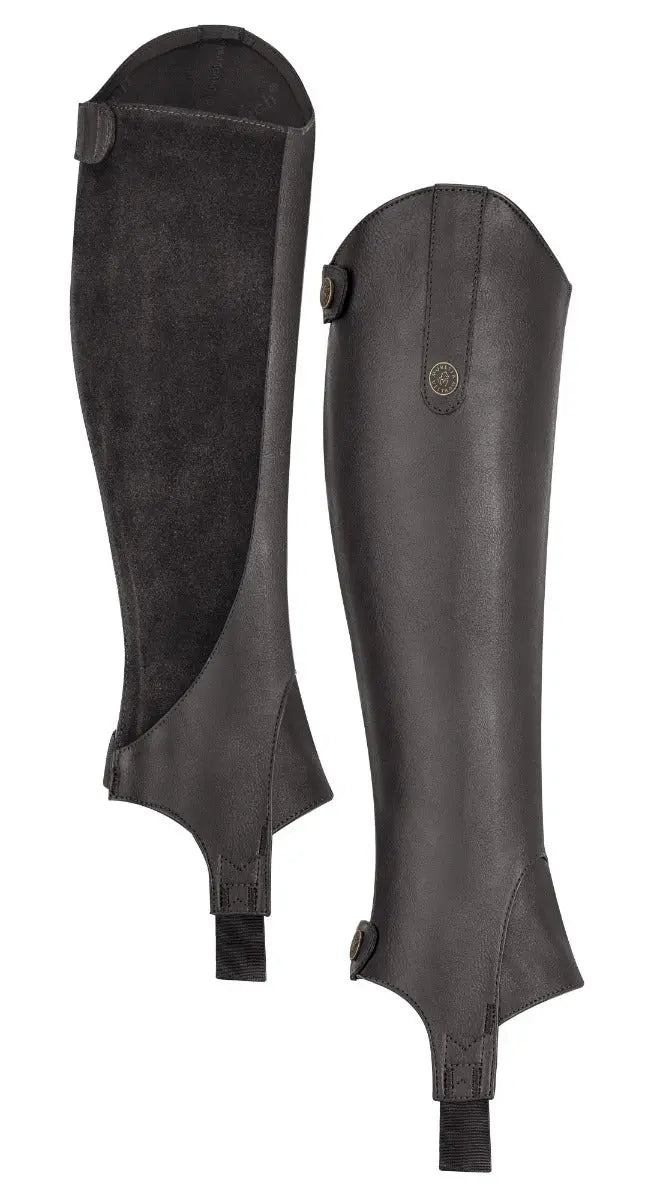 These fantastic synthetic gaiters have the appearance of leather and feature genuine suede inserts at the inner calves. Stretch inserts, dressage cut tops, full length zips, elastic foot stirrups, stretch zip tidy straps, bound edges.