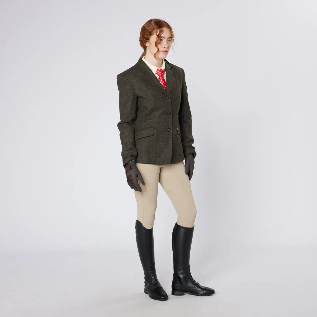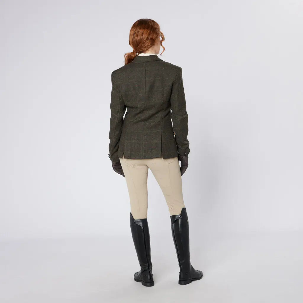 Reflecting a traditional fabric known for its durability and classic aesthetic, tweed also provides a textured and sophisticated look. The inclusion of traditional foxhead buttons adds a touch of heritage and authenticity to the jacket. Foxhead buttons are a classic element in equestrian and country-inspired clothing, contributing to the overall traditional and sophisticated look perfect for the show ring.