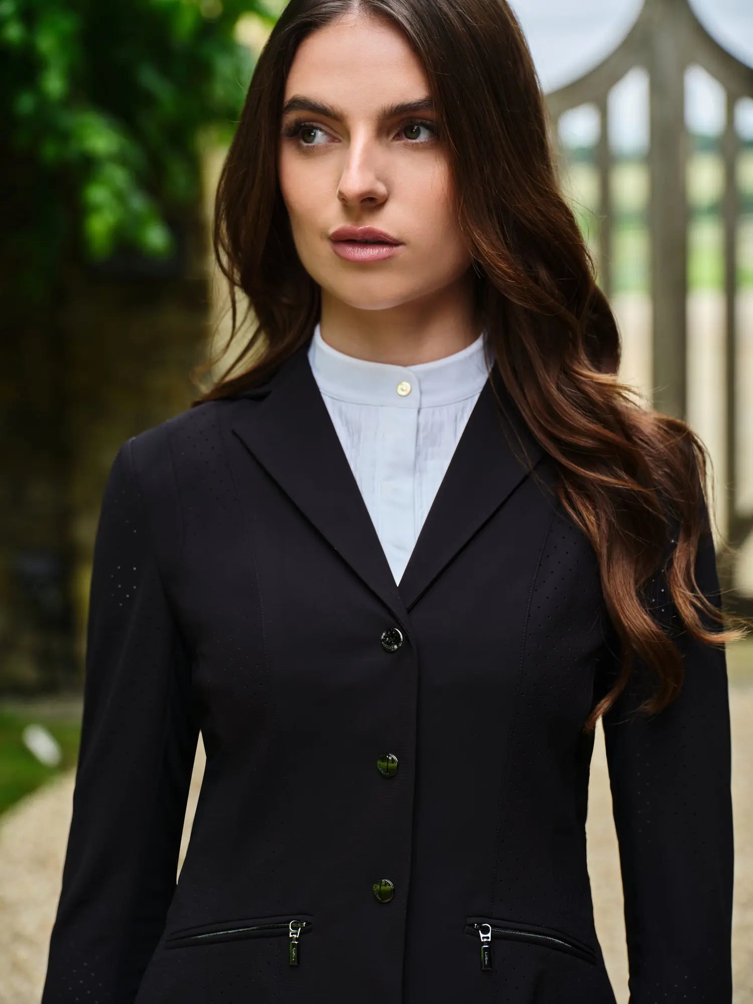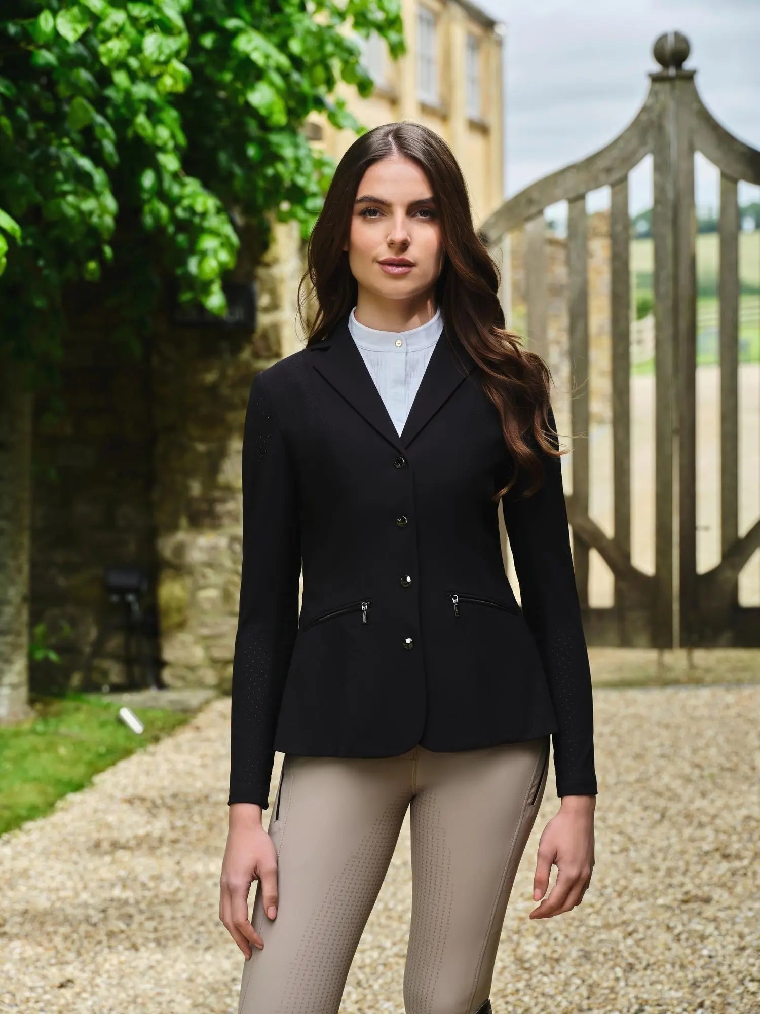 Competing in hot climates can be challenging, but this specialist technical performance jacket makes beating the heat a breeze.  It's a lightweight, breathable show jacket designed to take care of the temperature so you can focus on performing your best. Perforated panels and ultra-fine mesh under the arms and armpits ensure ventilation and airflow, no matter how hard you work. With elegant yet sporty contour seam lines and exposed zip pockets, it uses minimal fabric to maximum effect, to fit and flatter your figure as you ride.