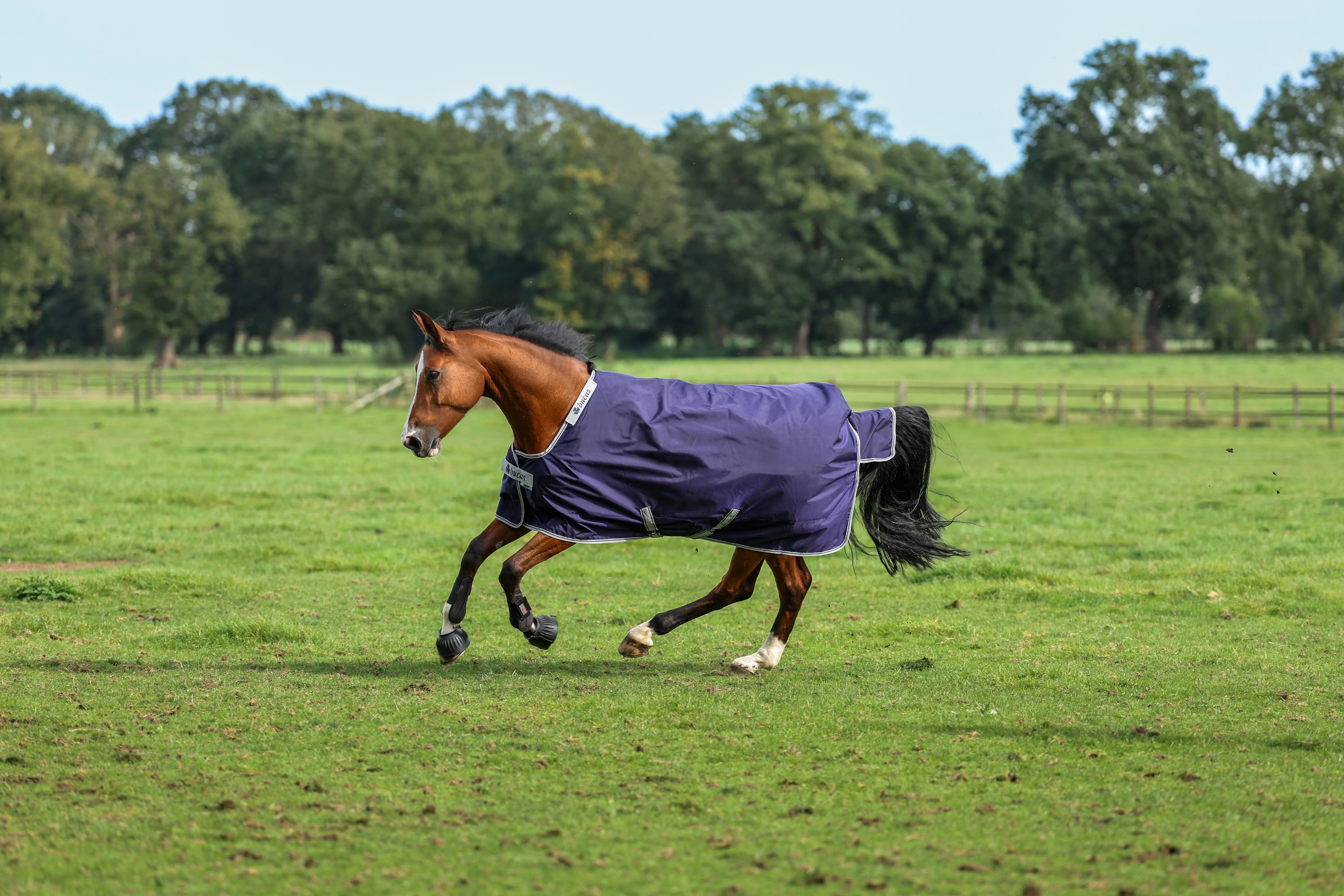 For a secure and adaptable fit, the rug includes the Click’n Go front closure with magnetic Snap-lock, shoulder darts, cross surcingles, deluxe leg straps, a tail flap, and deluxe tail cord. It also comes with neck attachment points and is compatible with Bucas liners, quilts and coolers, allowing for easy layering as needed.