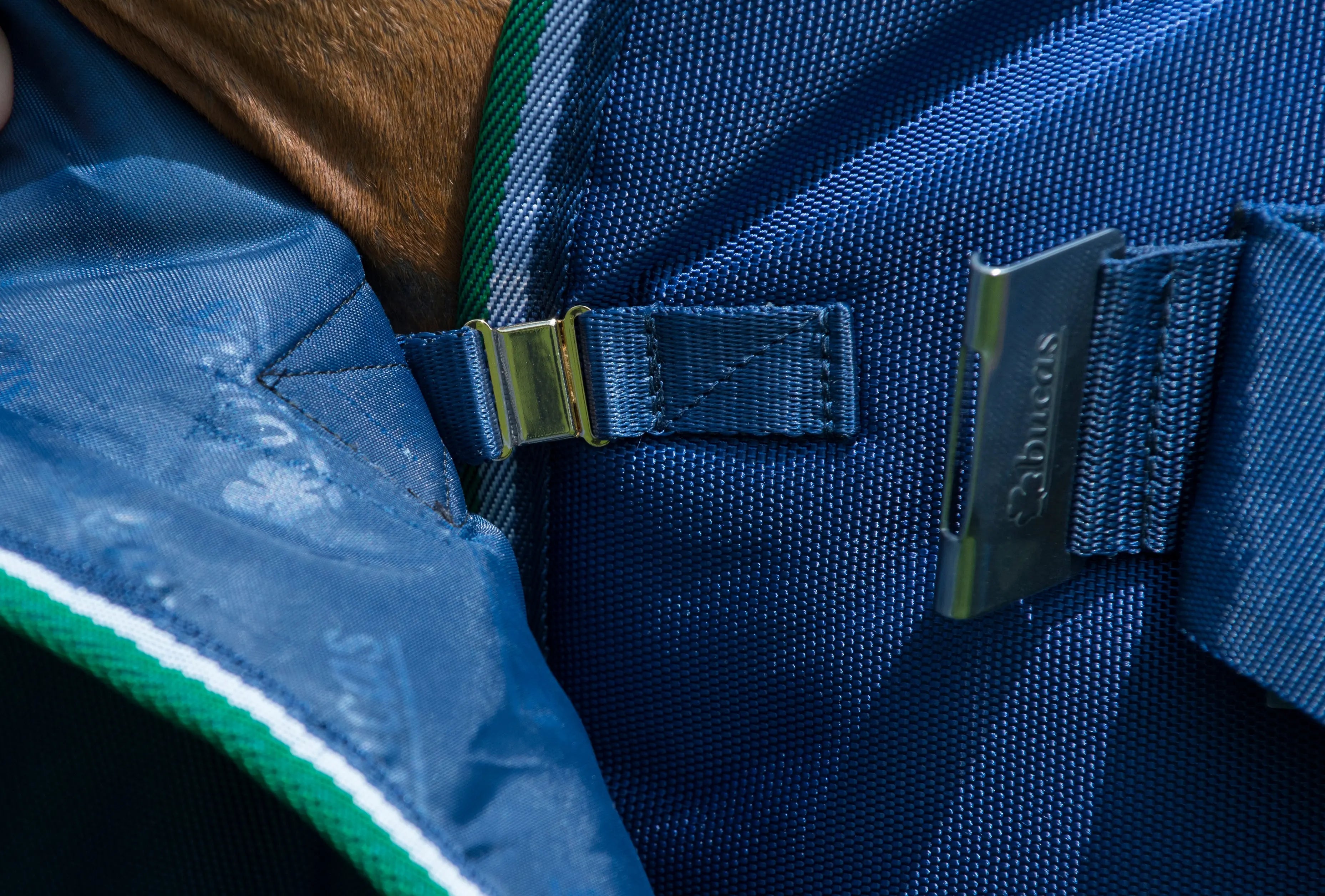 A silk-feel shoulder lining helps reduce friction and prevent rubbing in sensitive areas. The rug also features Bucas’ Click’n Go front closure with magnetic Snap-lock, shoulder darts for improved freedom of movement, cross surcingles, deluxe leg straps, a tail flap and deluxe tail cord for a secure and comfortable fit. Neck attachment points are included, and the rug is compatible with Bucas liners, quilts and coolers, giving you layering flexibility as temperatures change.