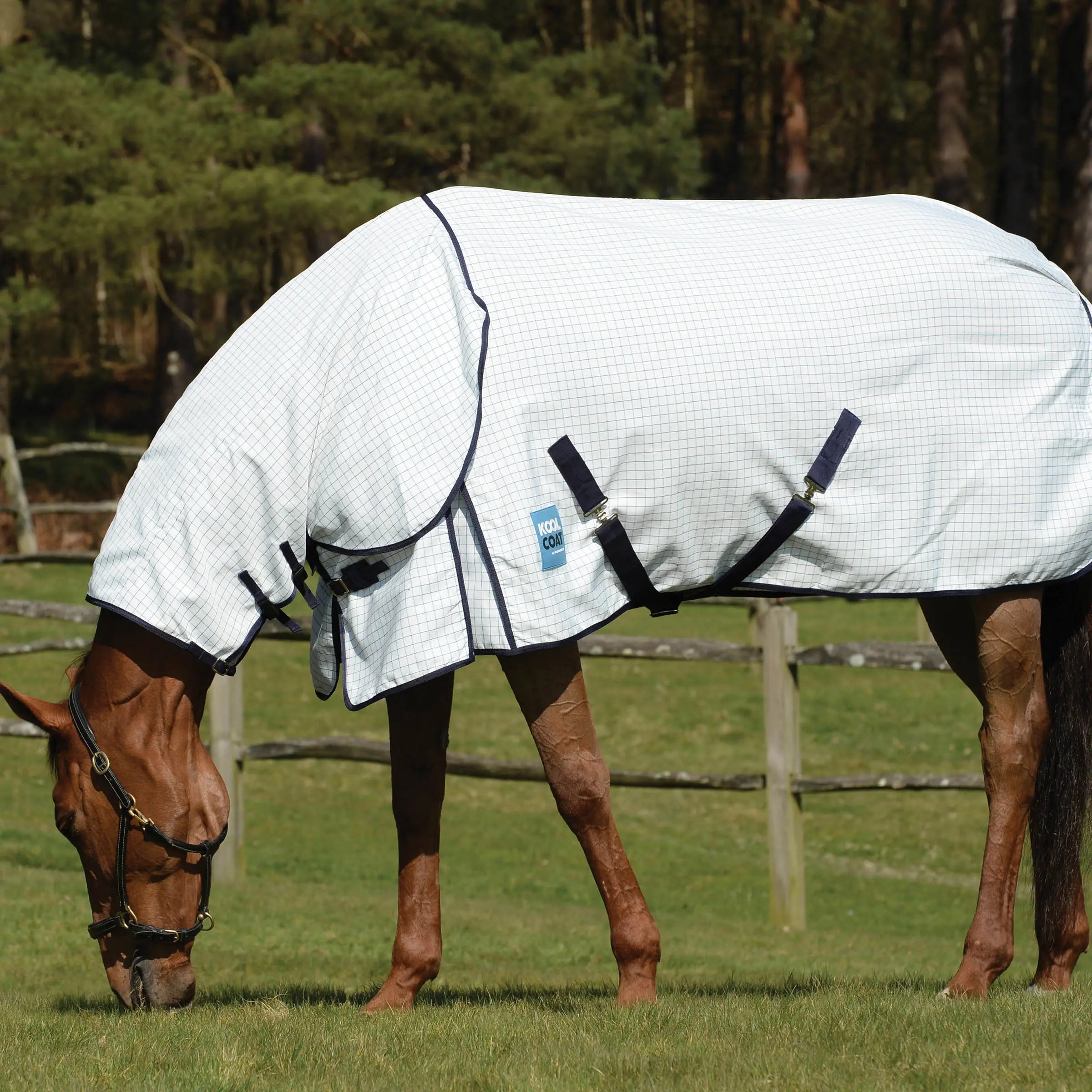 A great everyday durable summer sheet with over 90% UV protection. The Kool Coat Classic With Surcingles III Combo Neck has a strong and lightweight 270g polyester outer with polyester lined shoulders to help prevent rubbing. Featuring traditional shoulder gussets, twin adjustable buckle front closure, twin low cross surcingles, large tail flap and adjustable & removable web leg straps.