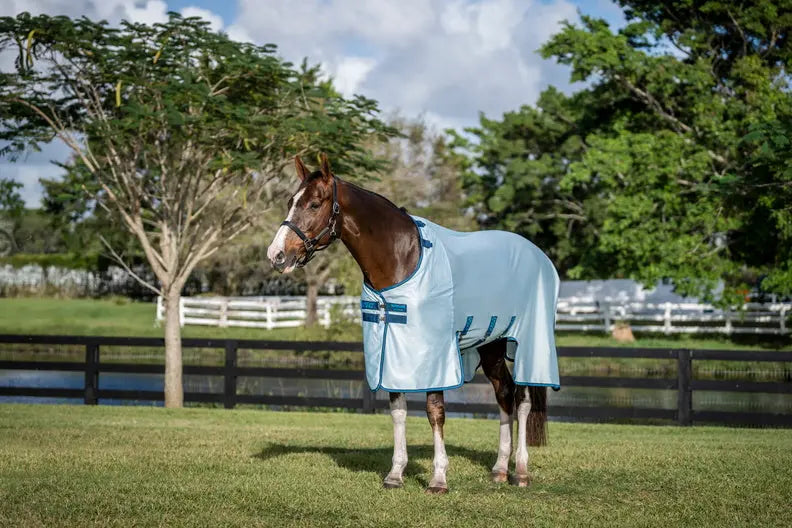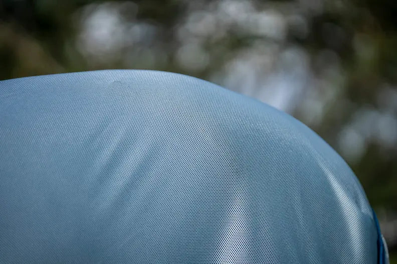 Cut from a strong, lightweight mesh, the close weave provides 65% UV protection and blocks out irritating insects. The extra-wide belly band gives excellent coverage for sensitive stomach area, secured by three straight surcingles with Velcro. The front and back leg arches allow freedom of movement, while shine-enhancing lining on the supersized protective tail flap, shoulder, and mane help keep your horse's skin healthy and happy.
